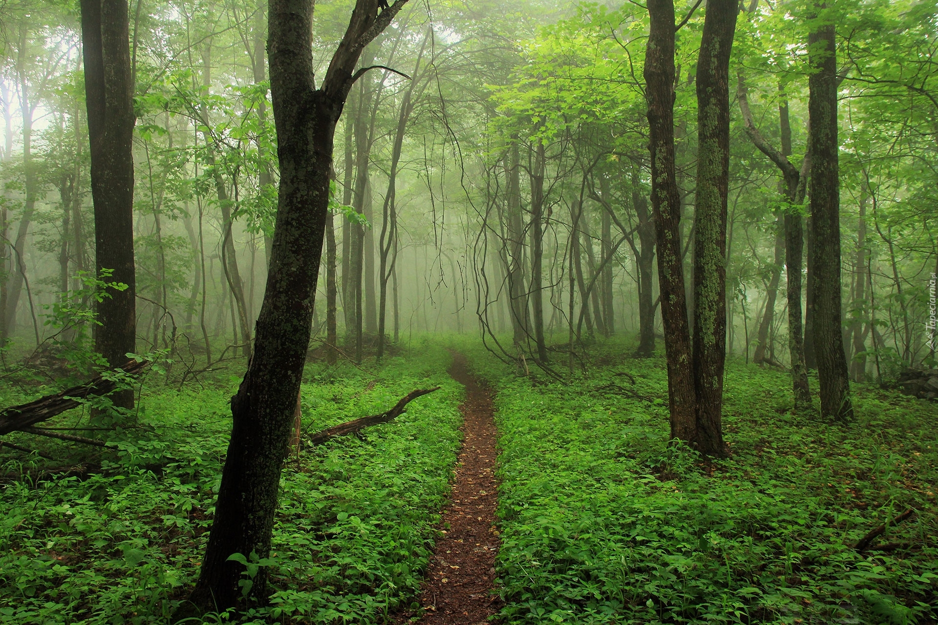 Edytor tapety: Ścieżka wśród zielonych roślin w zamglonym lesie