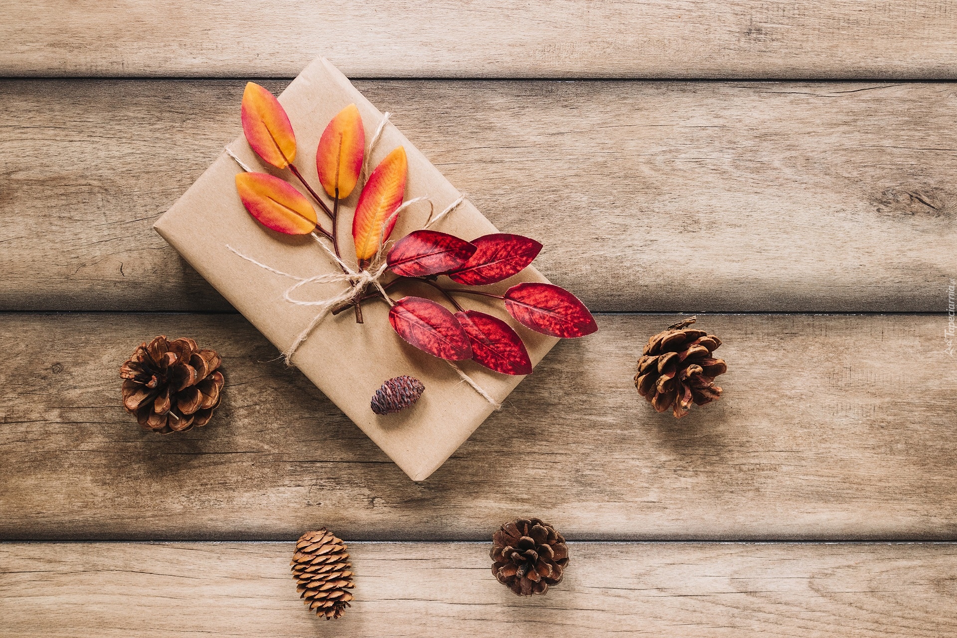 Edytor tapety: Jesienne liście na prezencie obok szyszek
