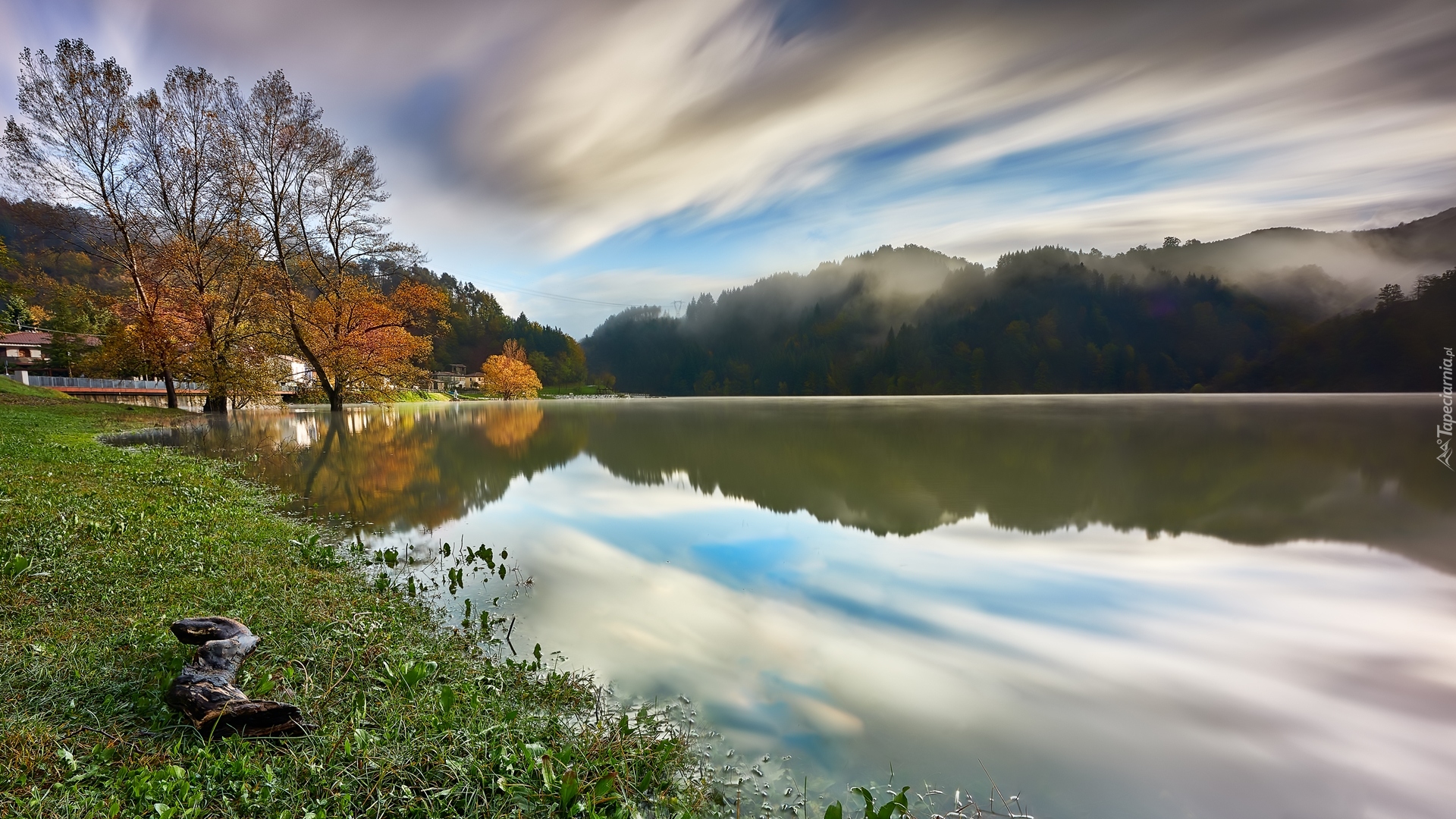 Edytor tapety: Drzewa nad jeziorem i zamglone wzgórza