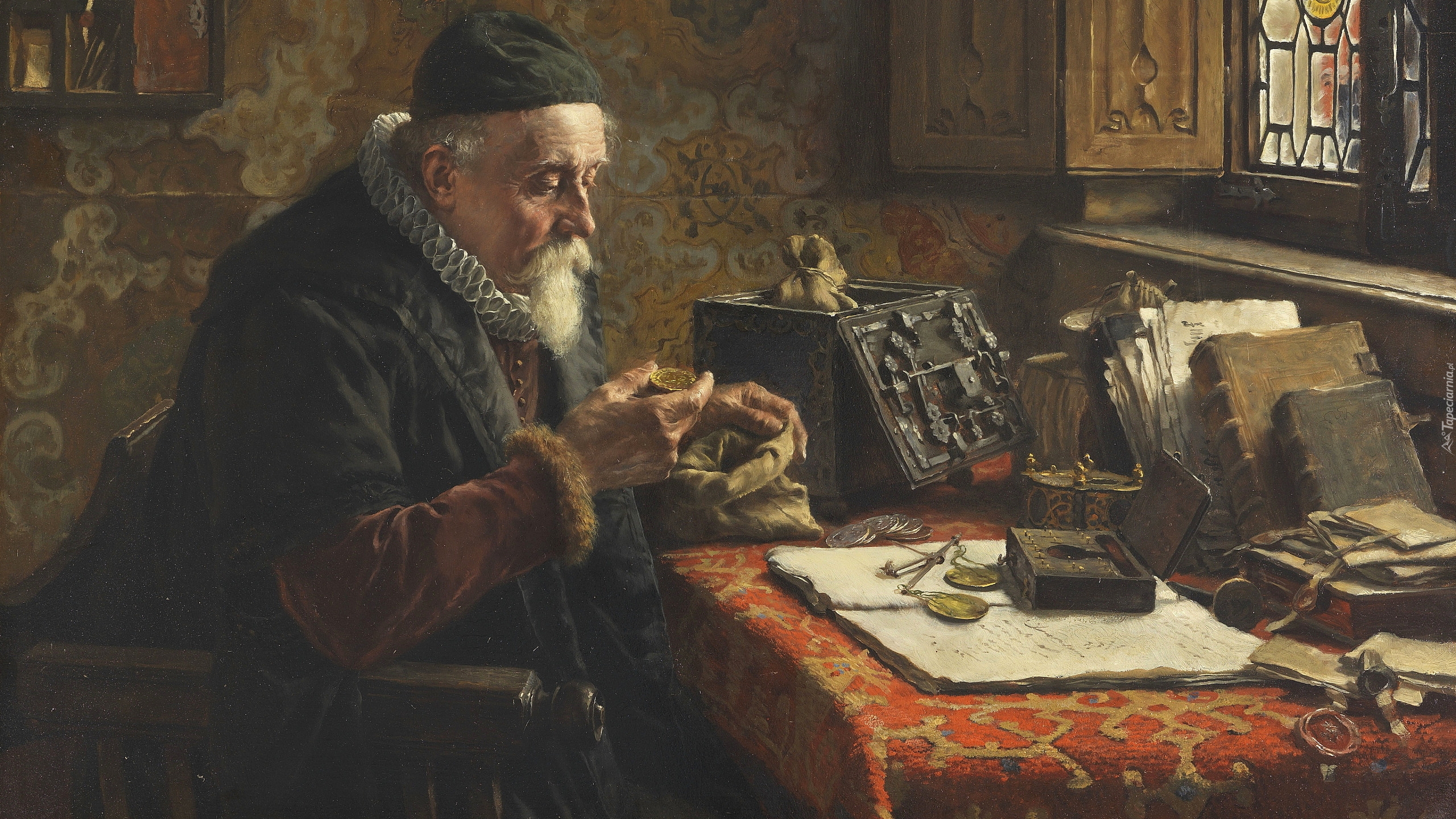 Edytor tapety: Mężczyzna liczący monety na obrazie Maxa Gaissera