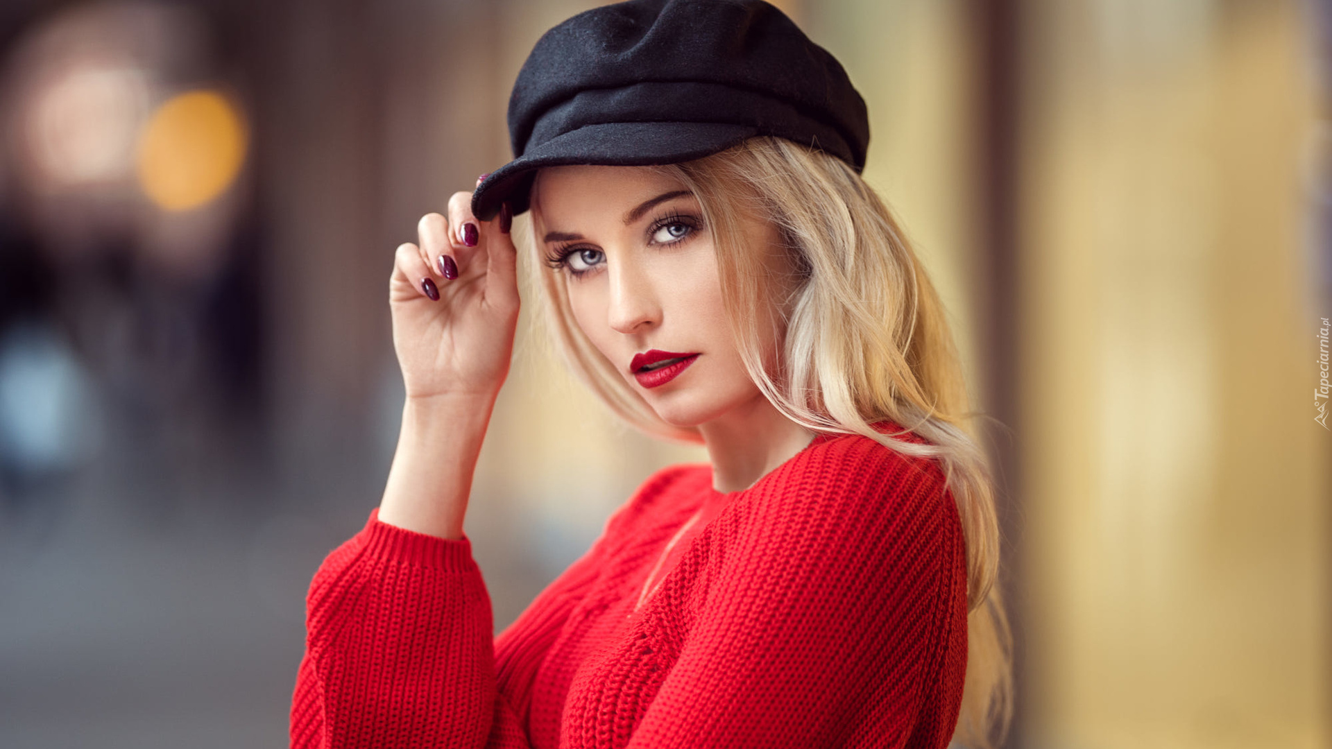 Edytor tapety: Kobieta w czapce i czerwonym swetrze