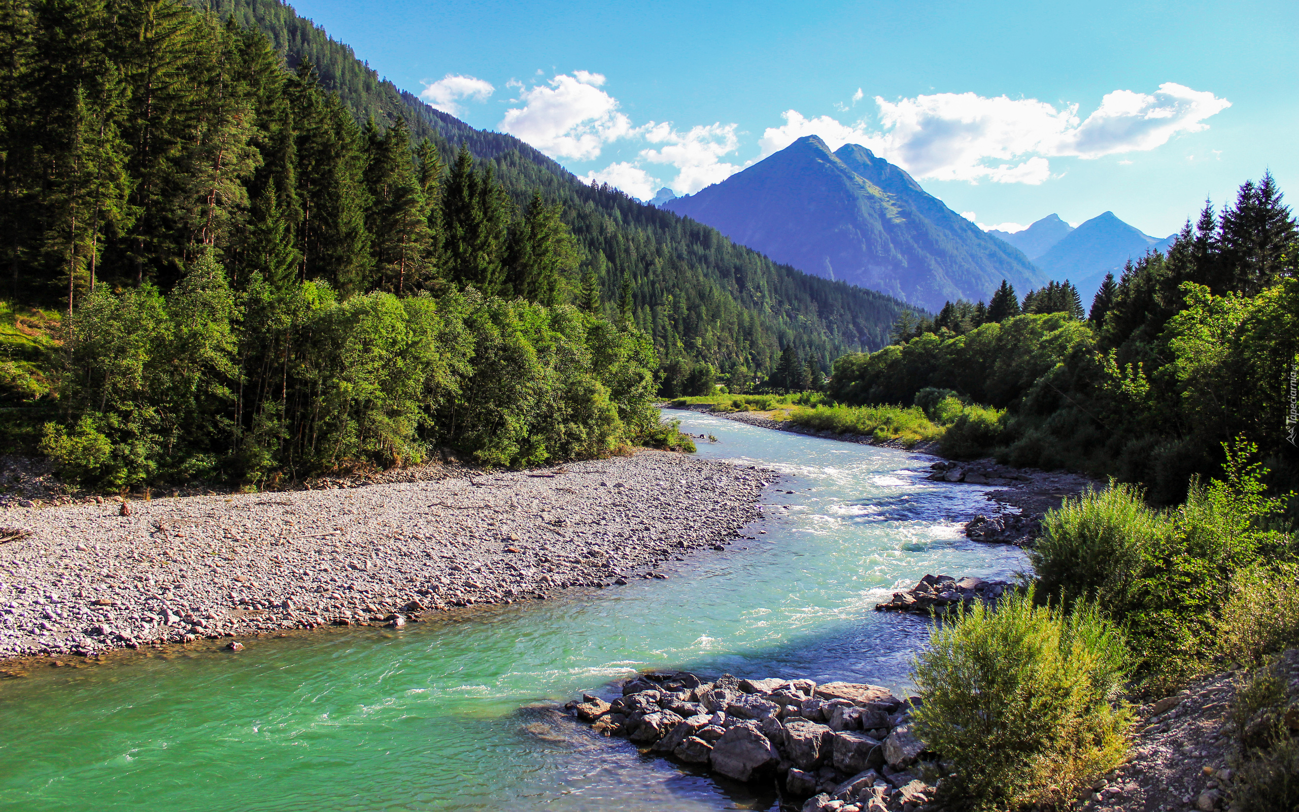 Edytor tapety: Rzeka pośród zielonych lasów na tle gór