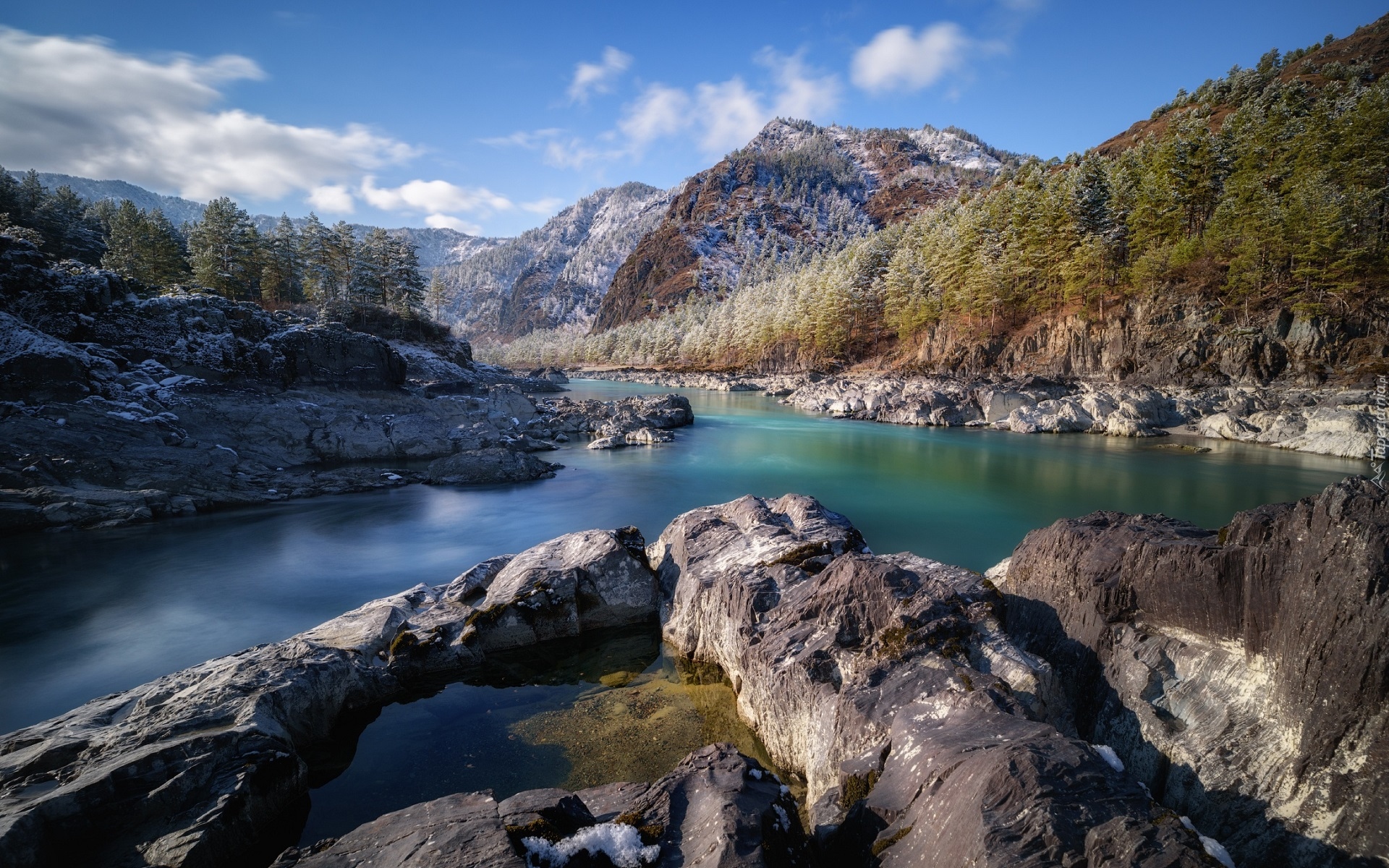 Edytor tapety: Skały na brzegu rzeki Katuń w górach Ałtaj