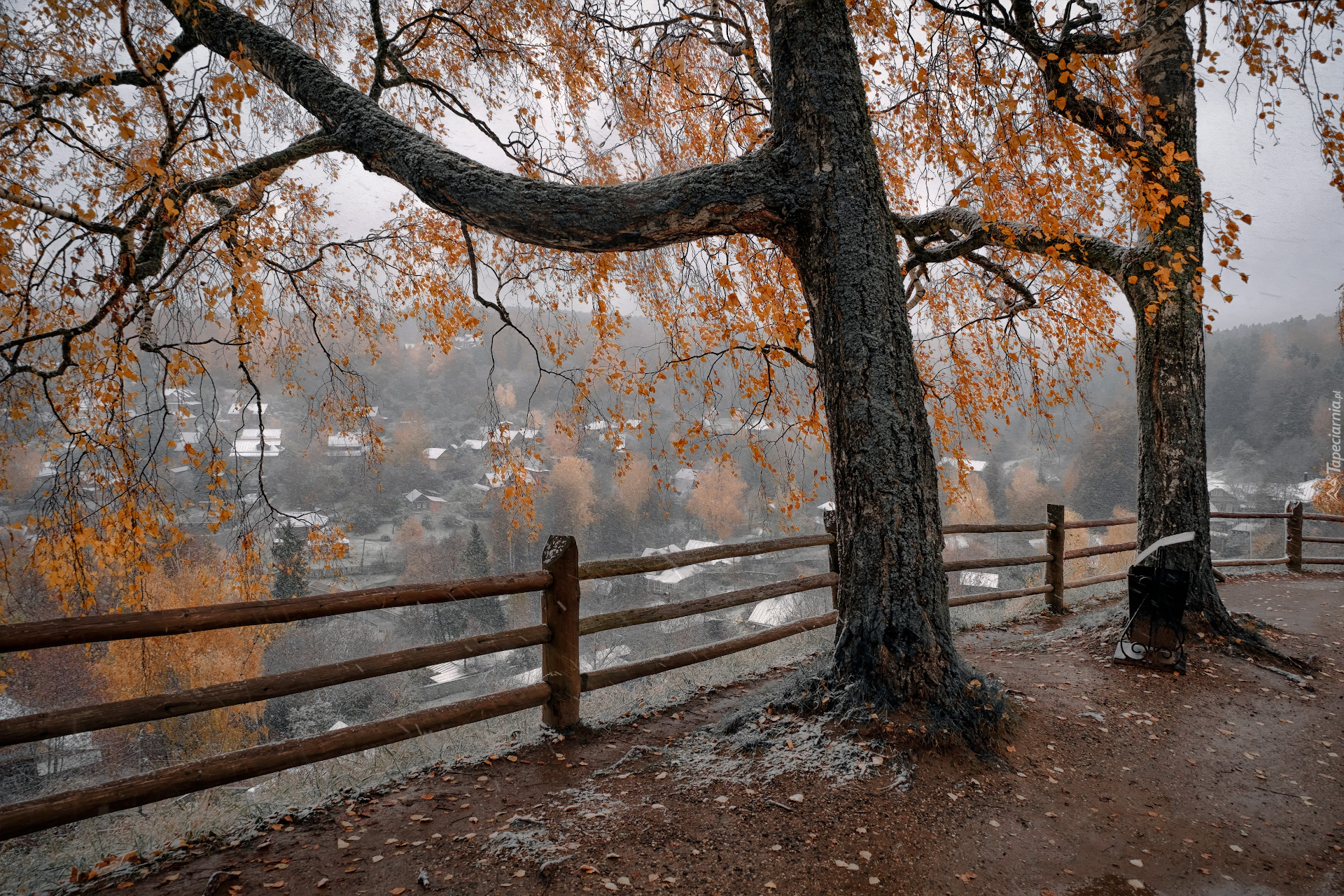 Edytor tapety: Jesienne brzozy w pierwszym śniegu nad miastem Plos