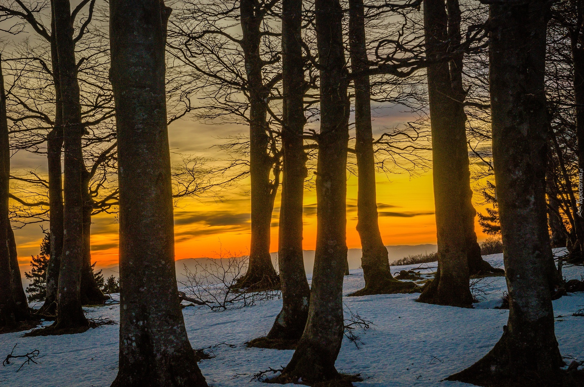 Edytor tapety: Drzewa w zimowym lesie na tle zachodzącego słońca