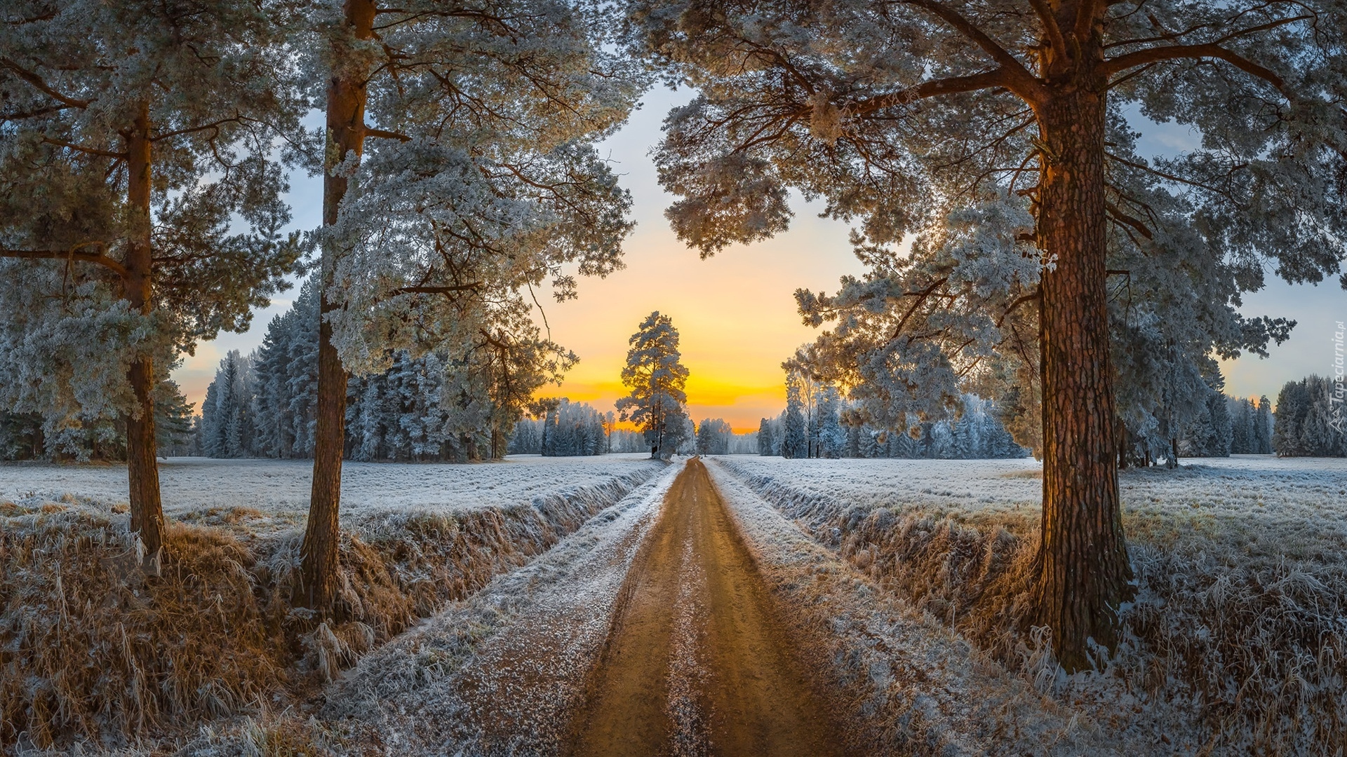 Edytor tapety: Szron na drzewach przy drodze o poranku