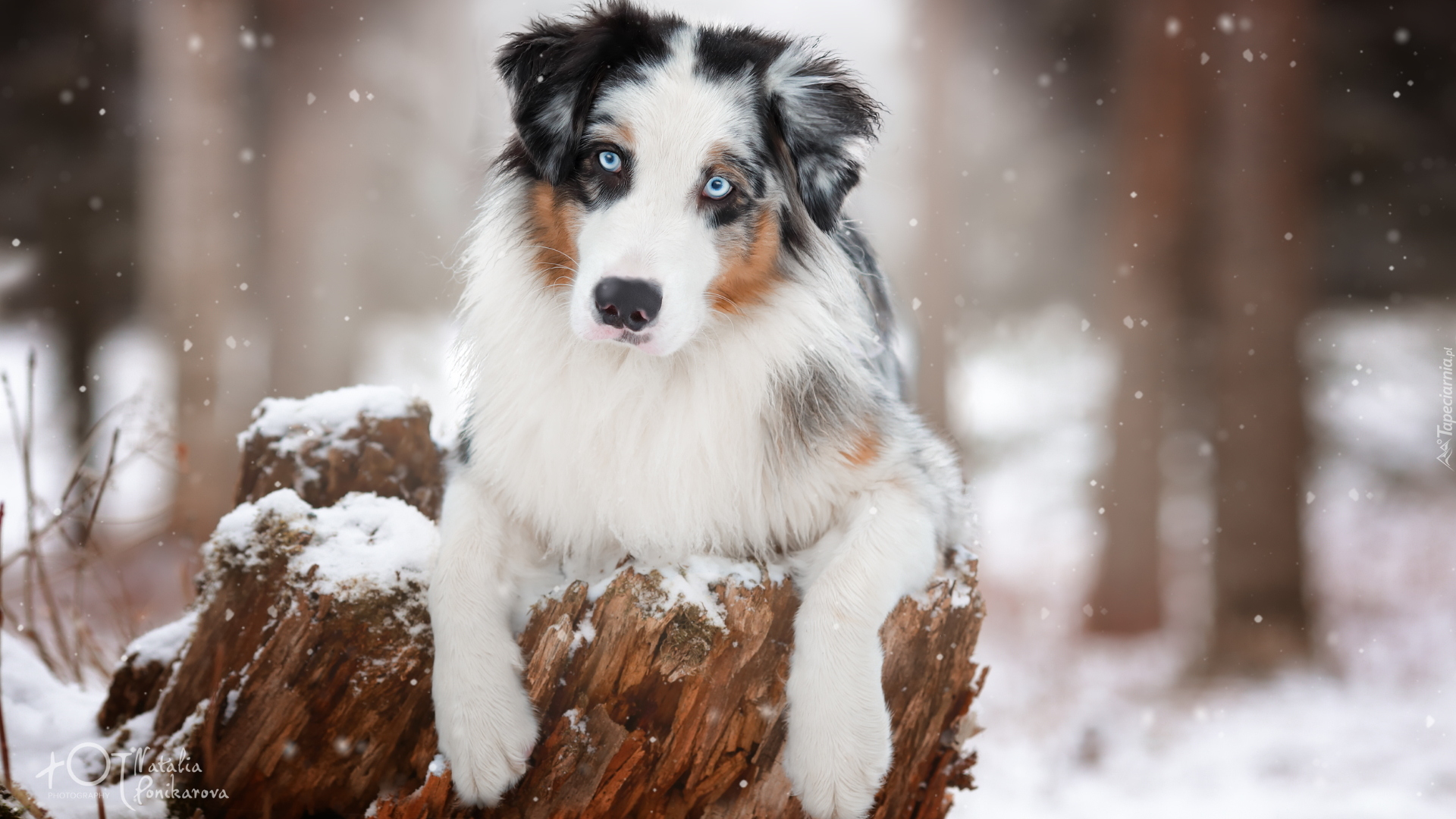 Edytor tapety: Owczarek australijski na ośnieżonym pniu