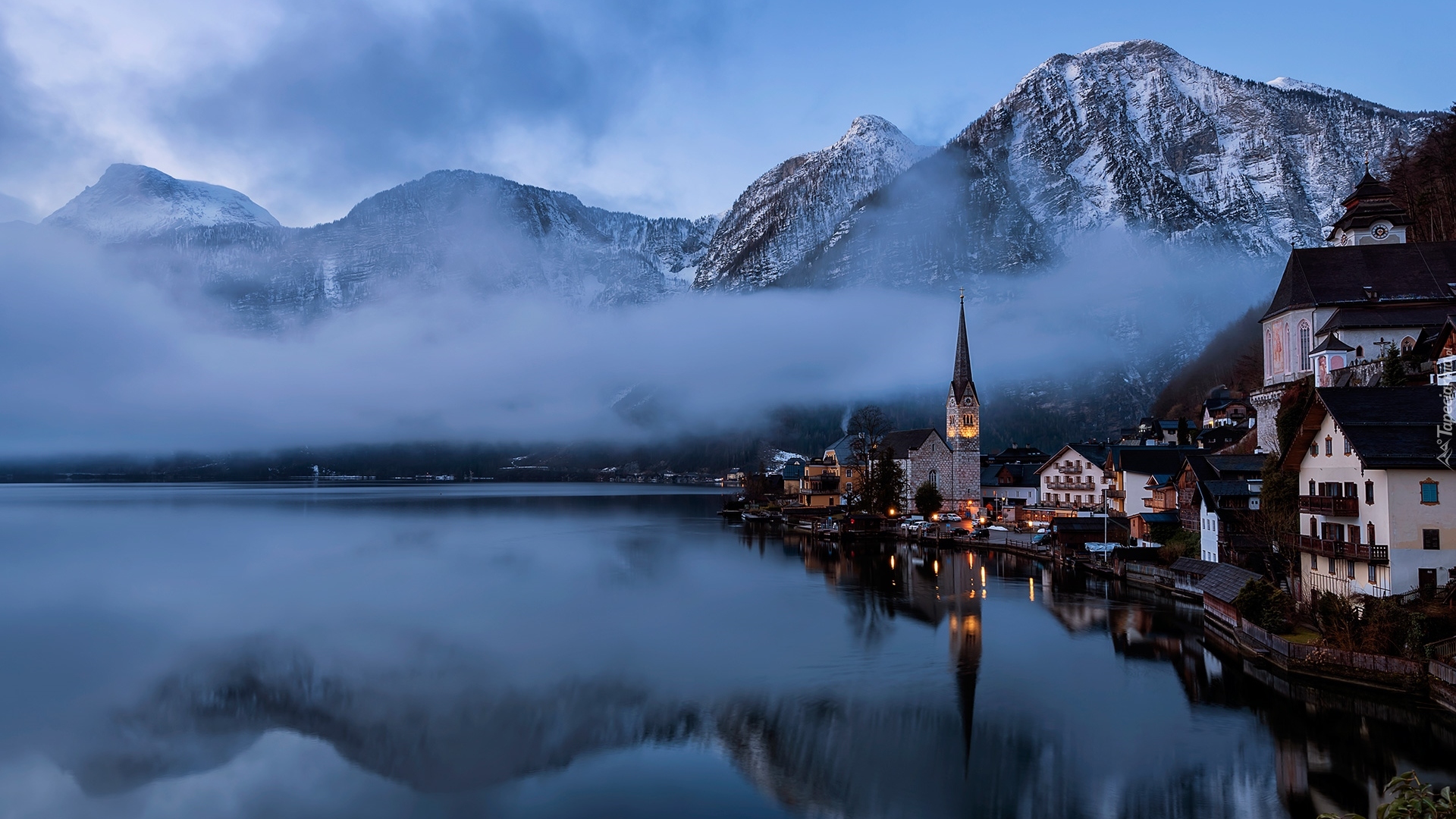 Edytor tapety: Jezioro Hallstattersee z widokiem na zamglone Alpy Salzburskie
