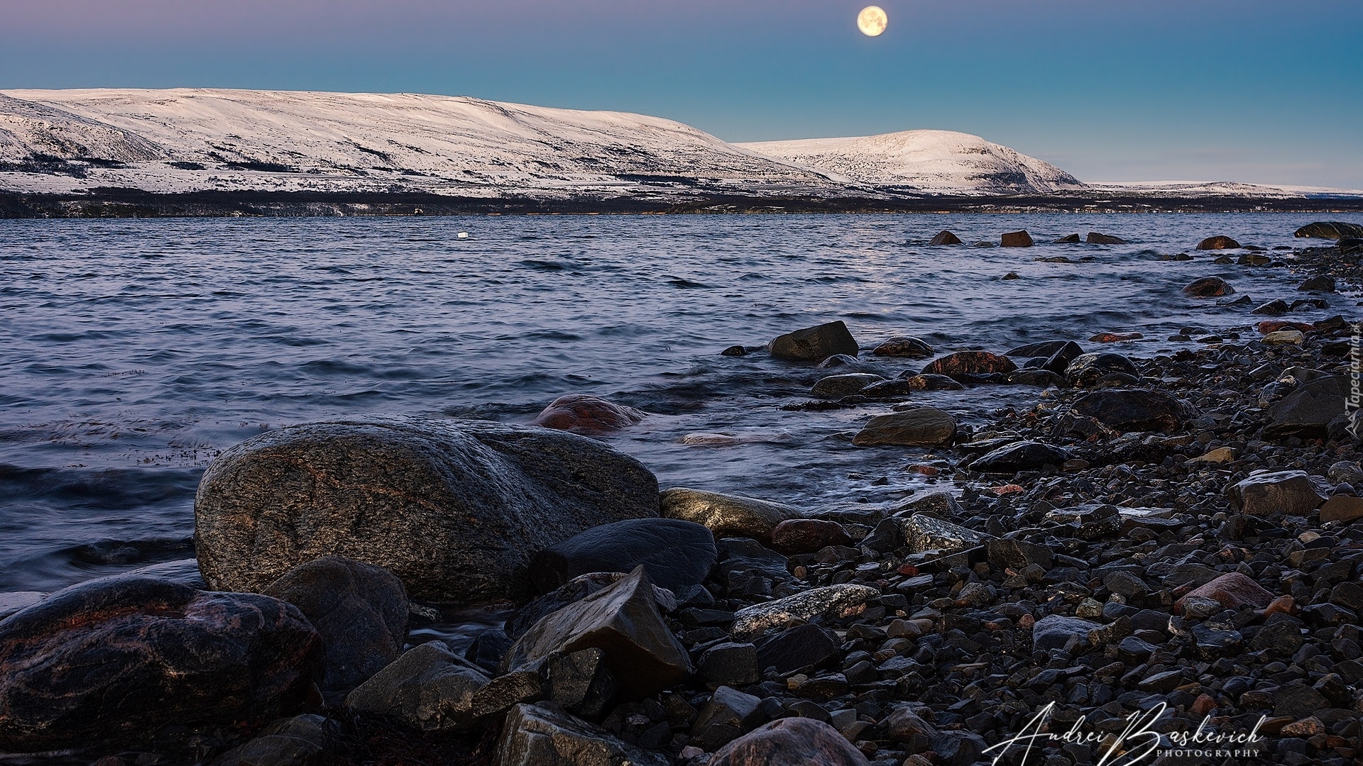 Edytor tapety: Księżyc nad górami i rzeką