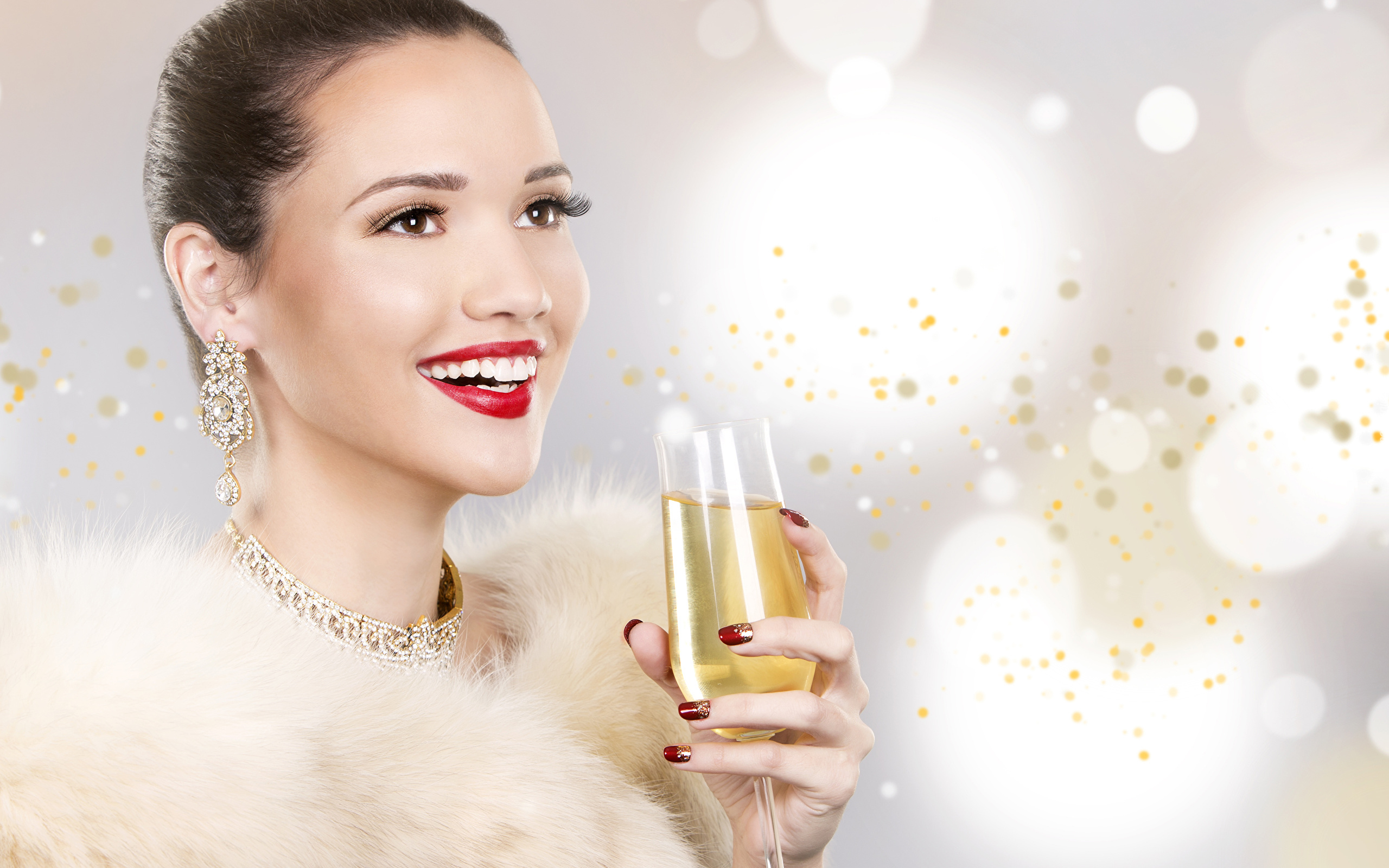 Edytor tapety: Uśmiechnięta kobieta z kieliszkiem szampana w dłoni