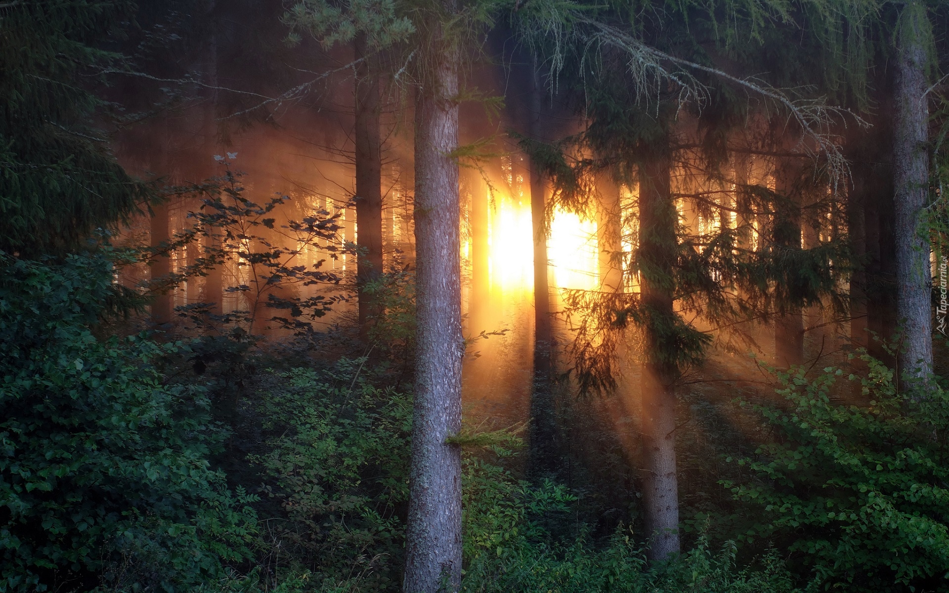 Edytor tapety: Drzewa i krzewy w rozświetlonym lesie