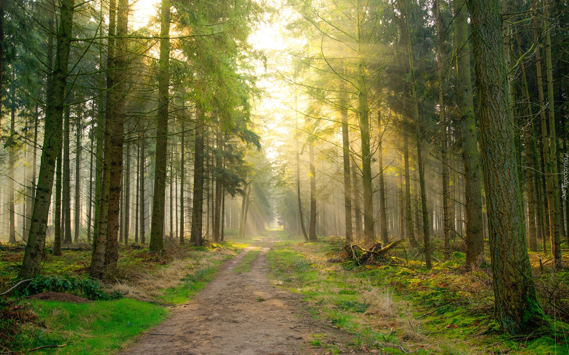 Edytor tapety: Rozświetlona słońcem leśna droga