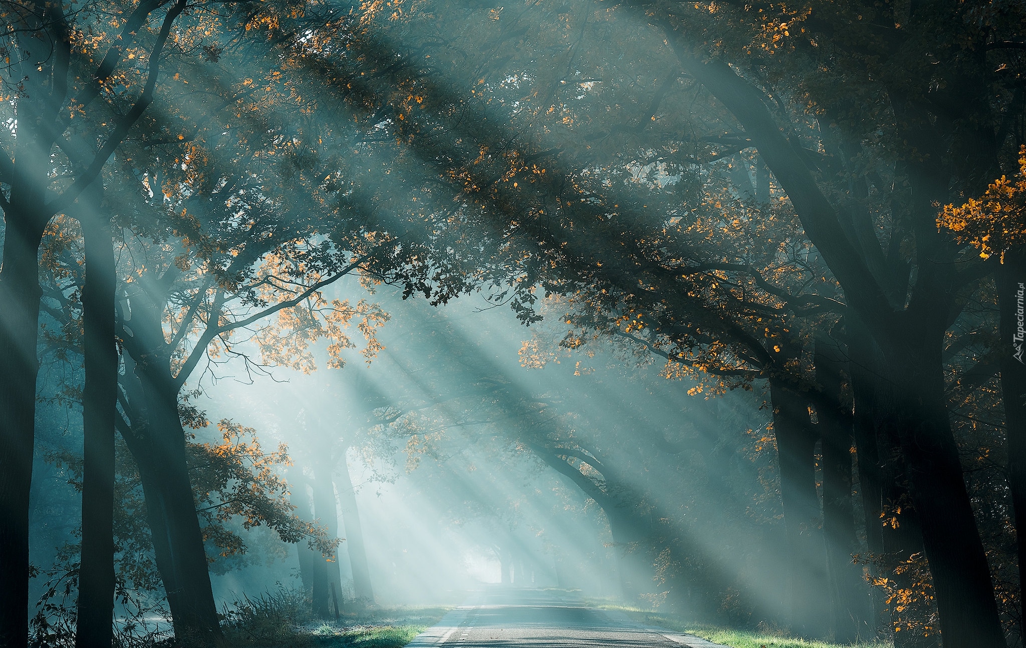 Edytor tapety: Droga pomiędzy drzewami w świetle słońca