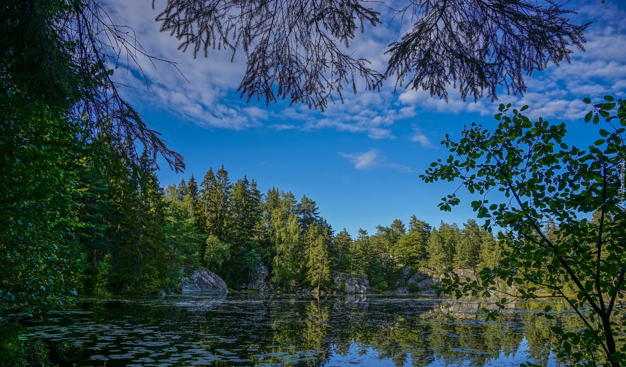 Edytor tapety: Pogodny letni dzień nad jeziorem wśród drzew
