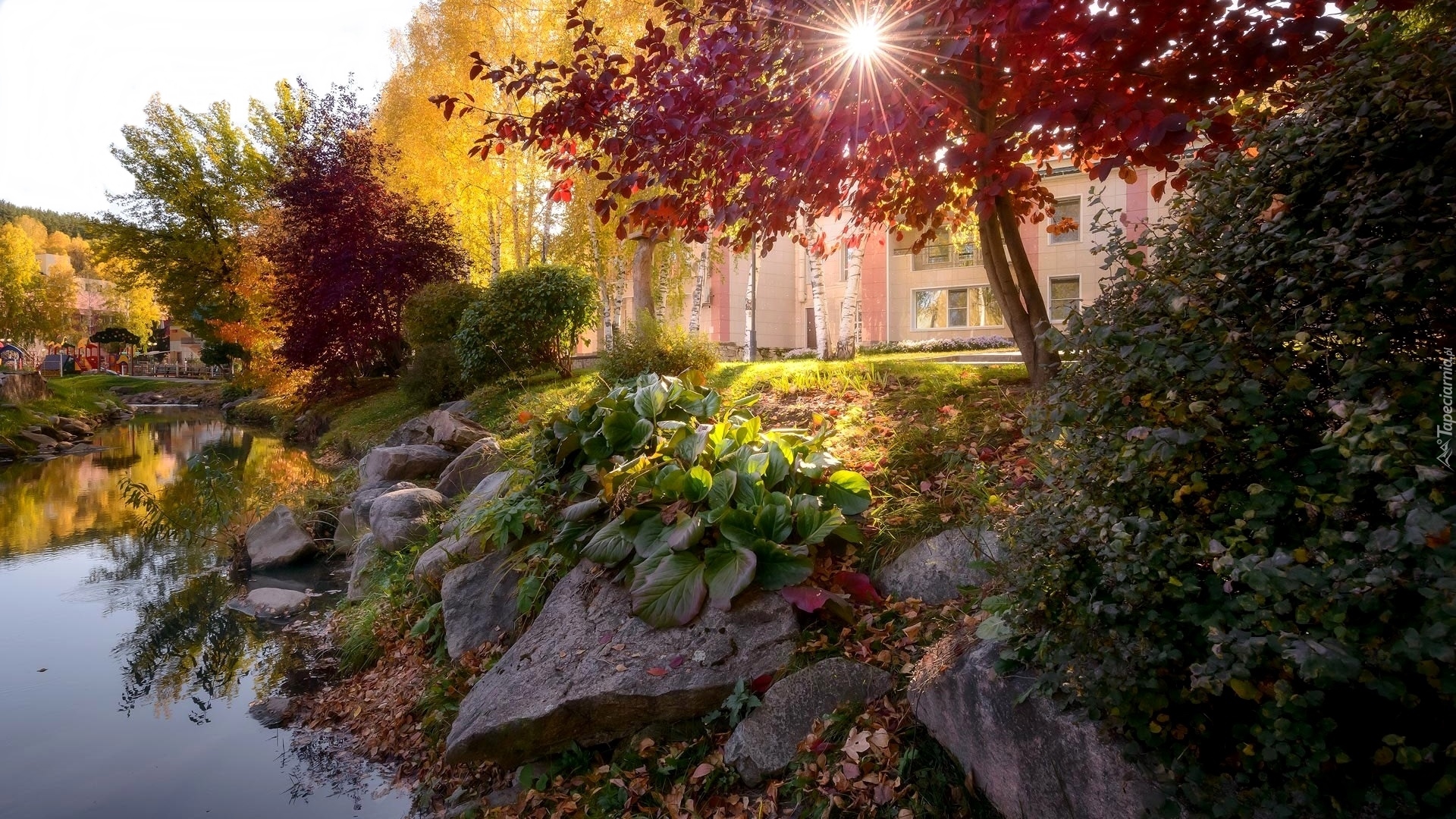 Edytor tapety: Rośliny i kolorowe drzewa nad rzeczką