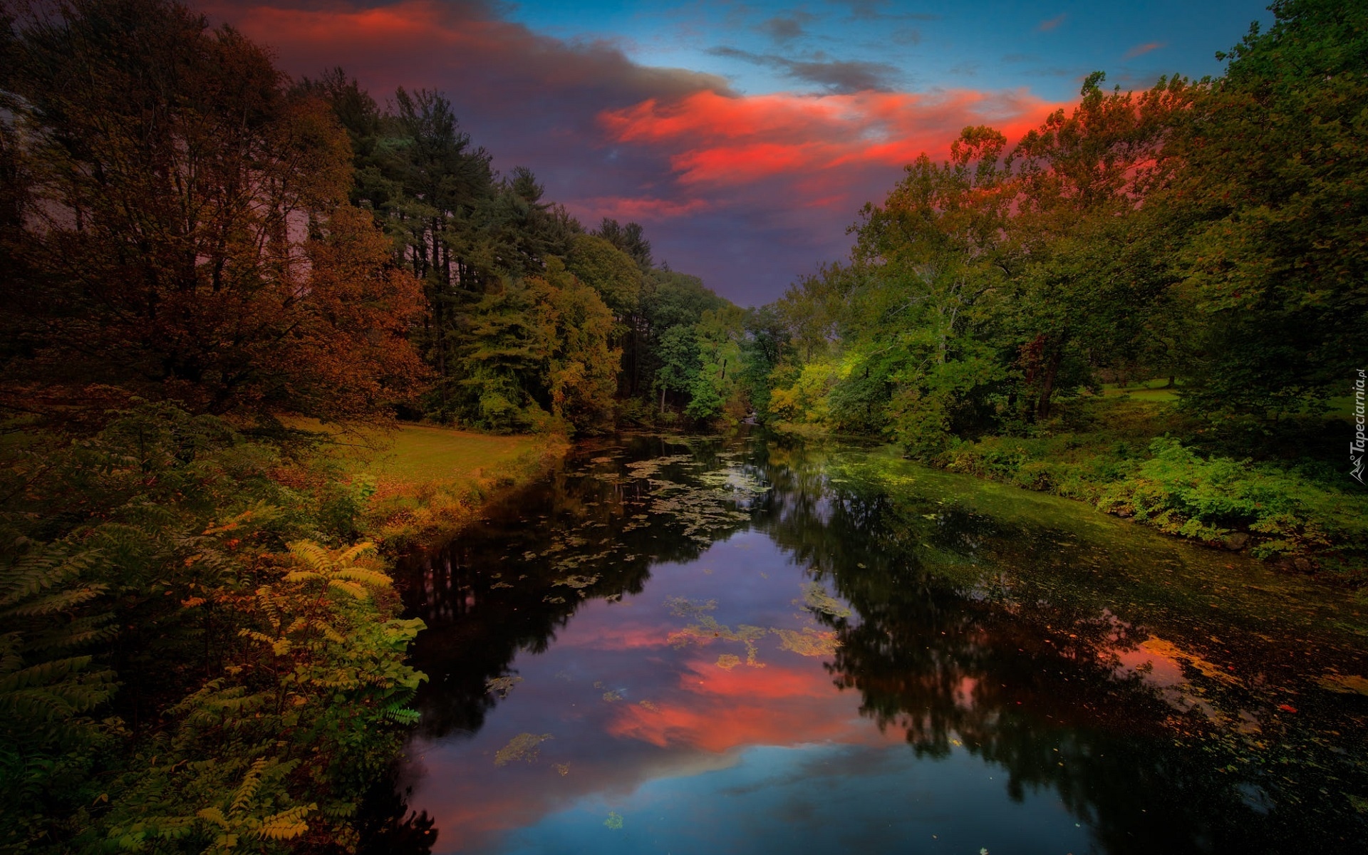 Edytor tapety: Kolorowy zachód słońca nad drzewami i stawem