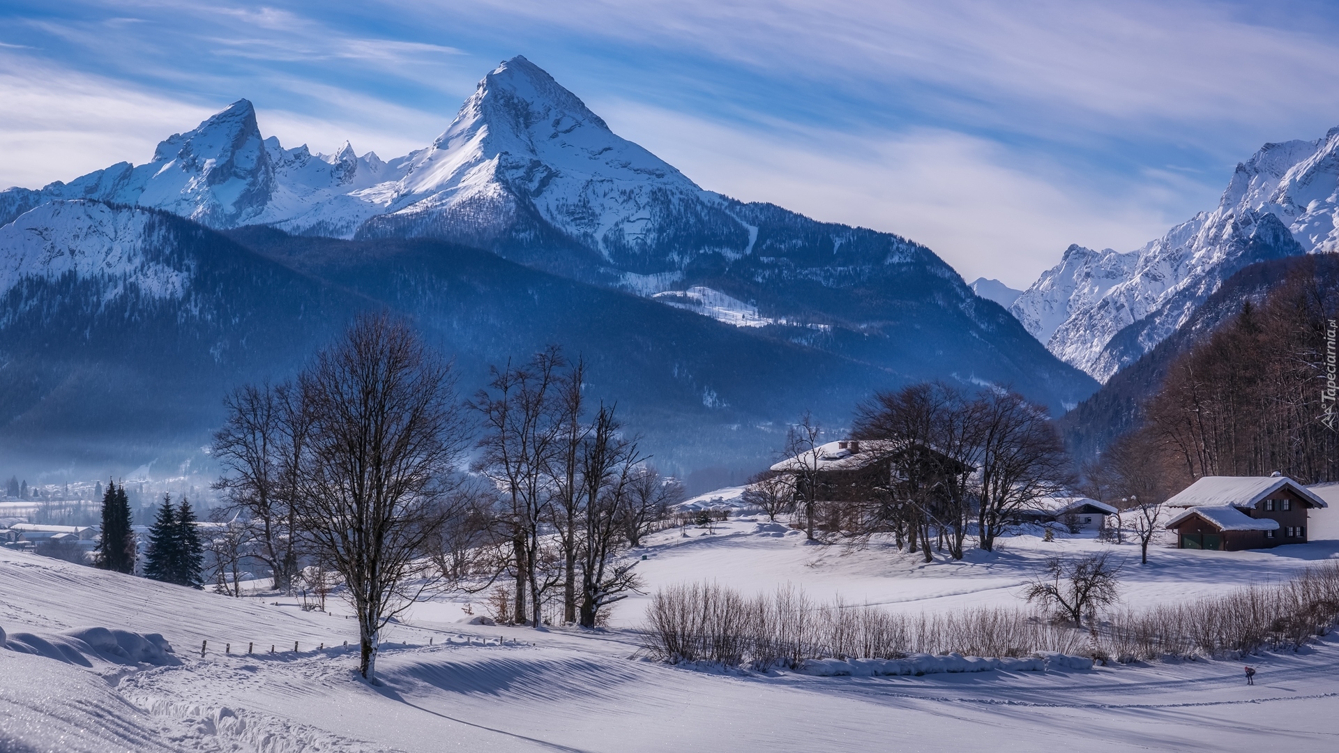 Edytor tapety: Domy w śniegu w górskiej dolinie