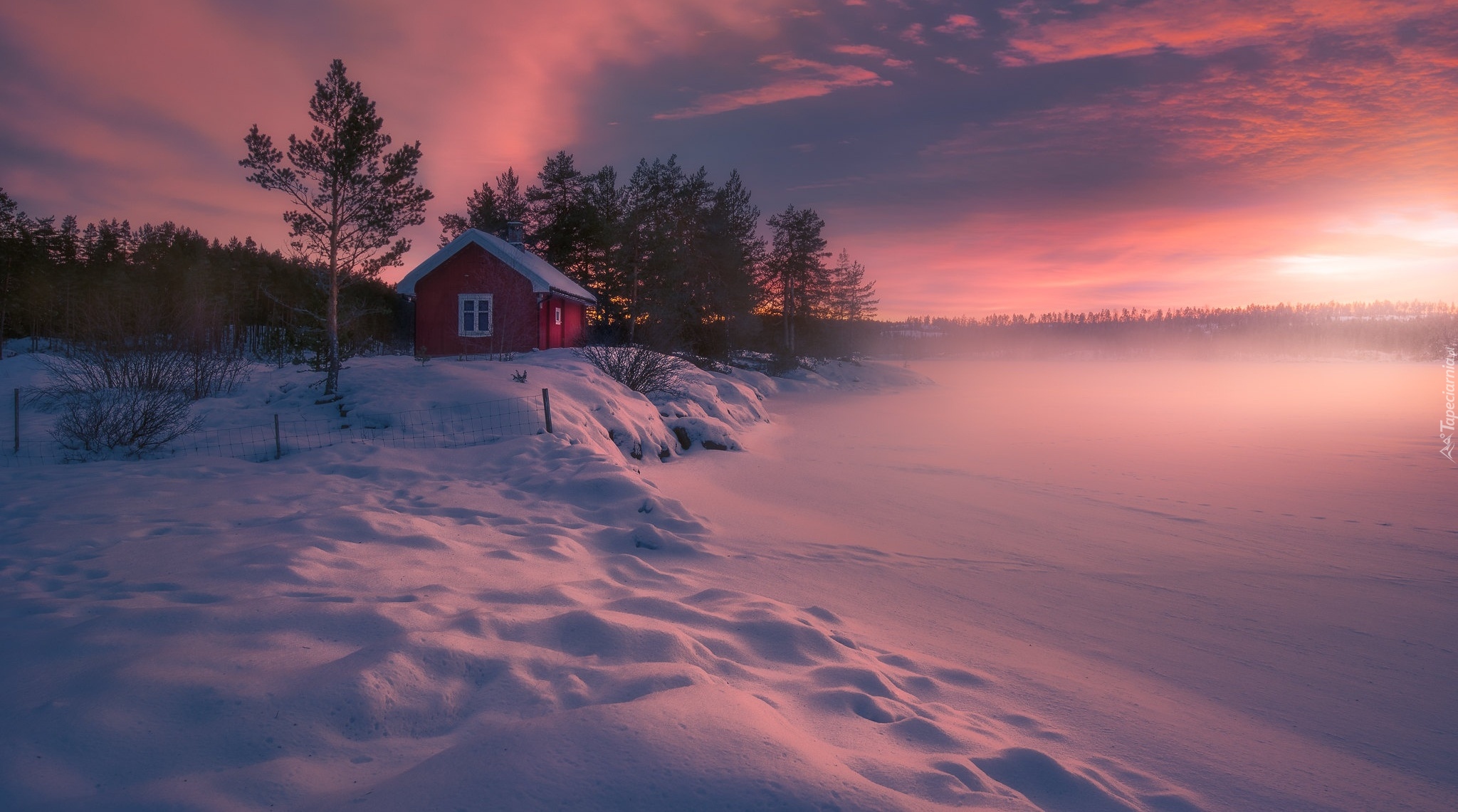 Edytor tapety: Czerwony domek i drzewa nad zaśnieżonym jeziorem