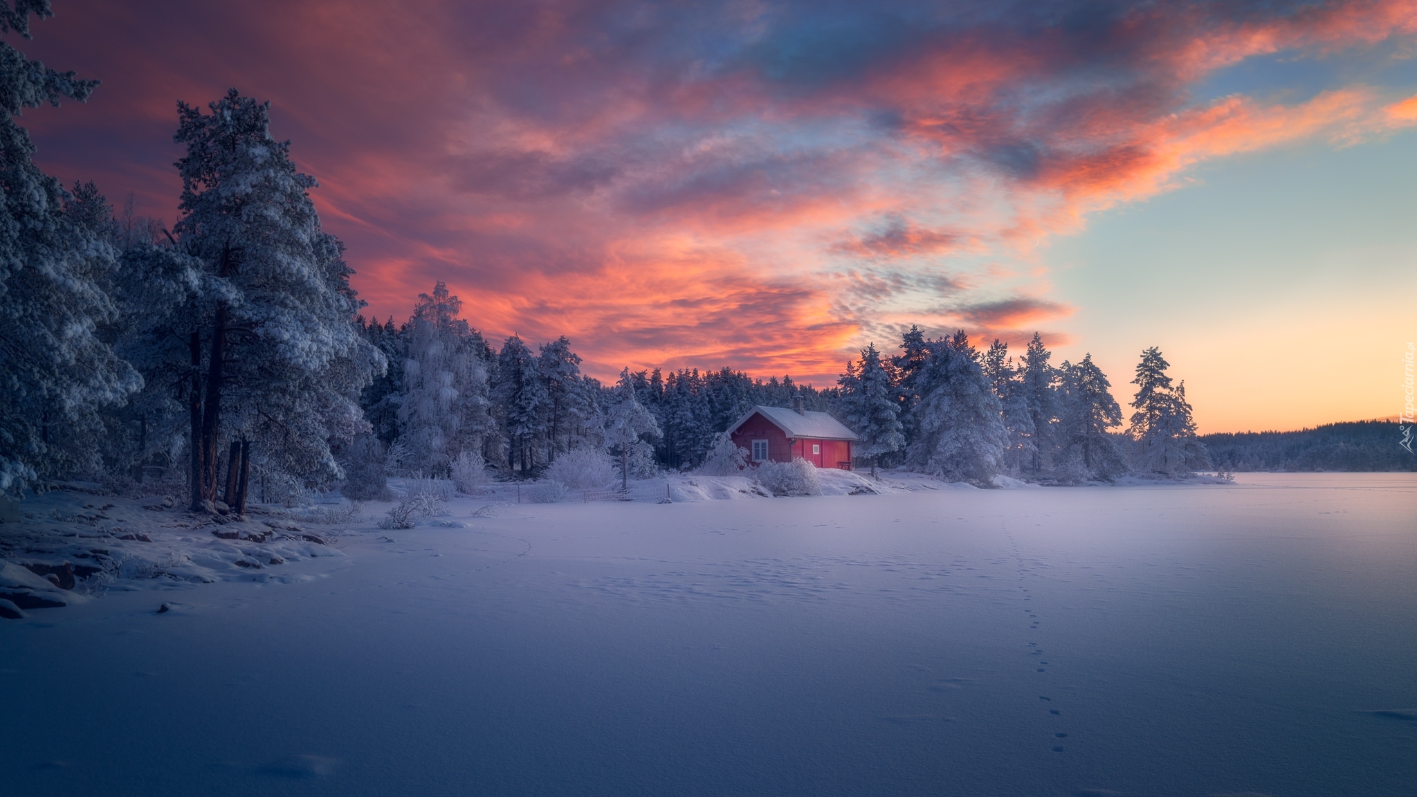 Edytor tapety: Czerwony domek pod zaśnieżonym lasem