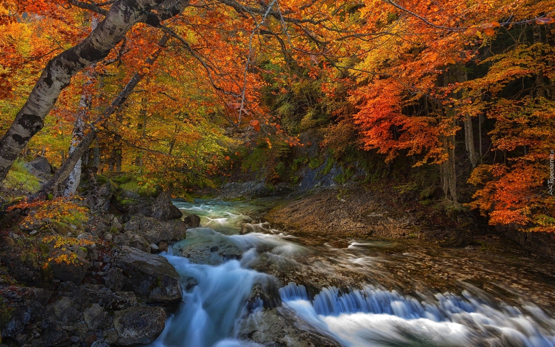 Edytor tapety: Jesienne drzewa na brzegach rwącego strumienia w lesie