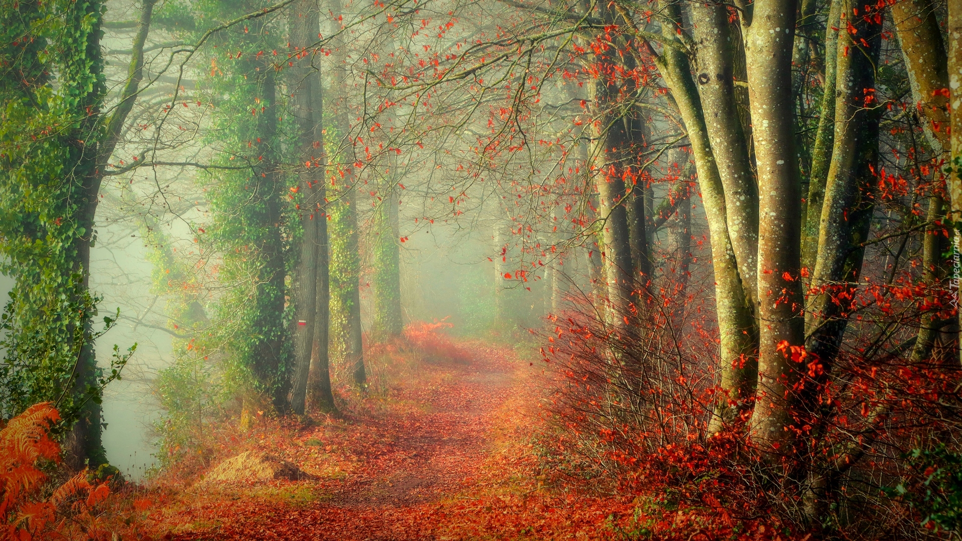 Edytor tapety: Opadłe liście na ścieżce w zamglonym lesie