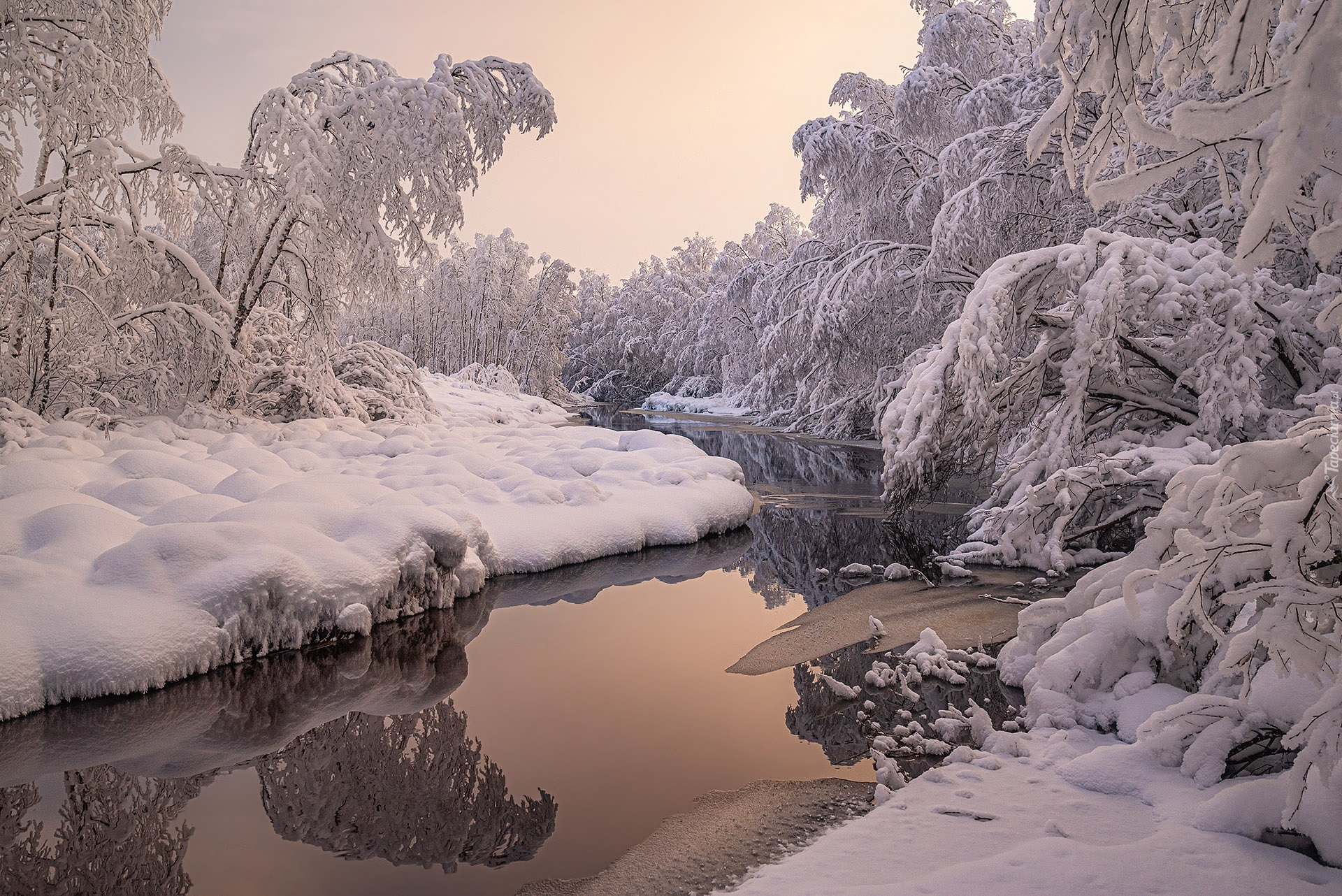 Edytor tapety: Rzeka wśród ośnieżonych drzew i roślin