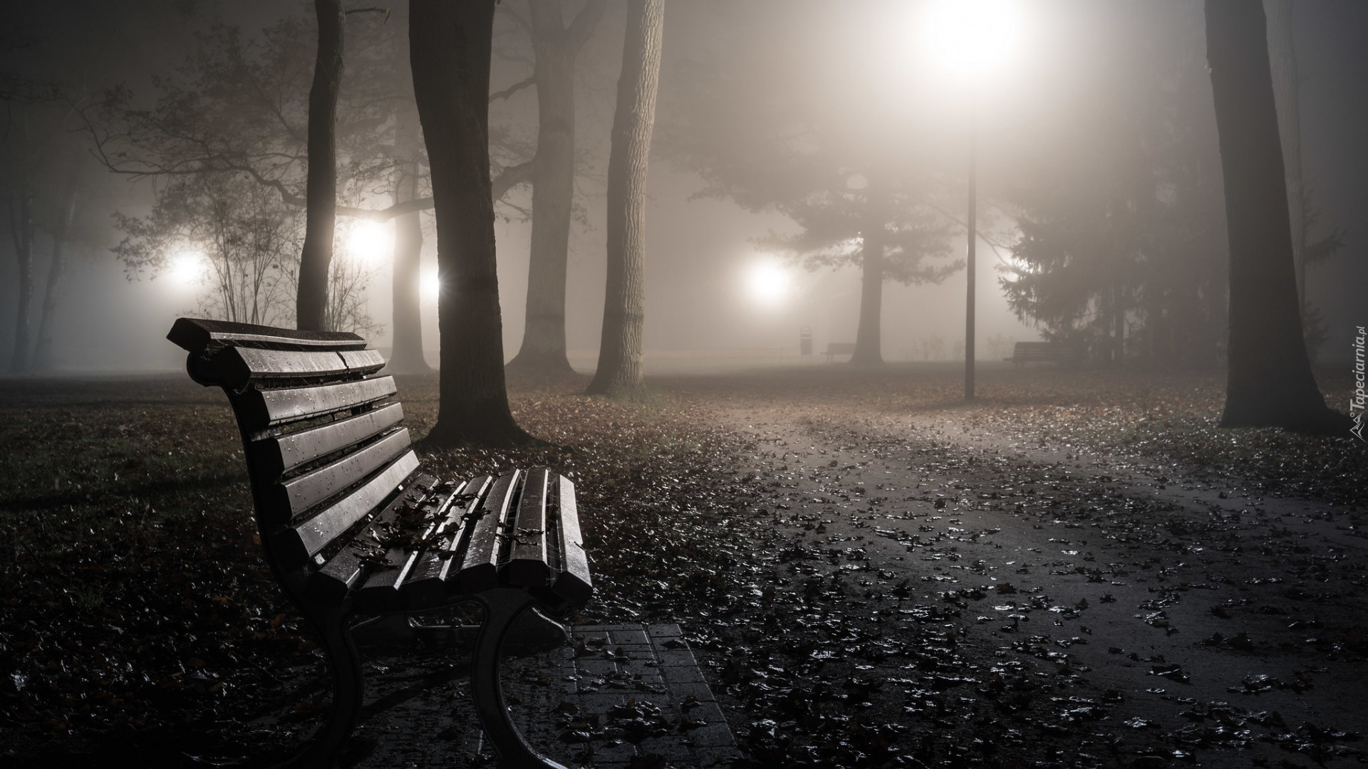 Edytor tapety: Ławka w zamglonym parku