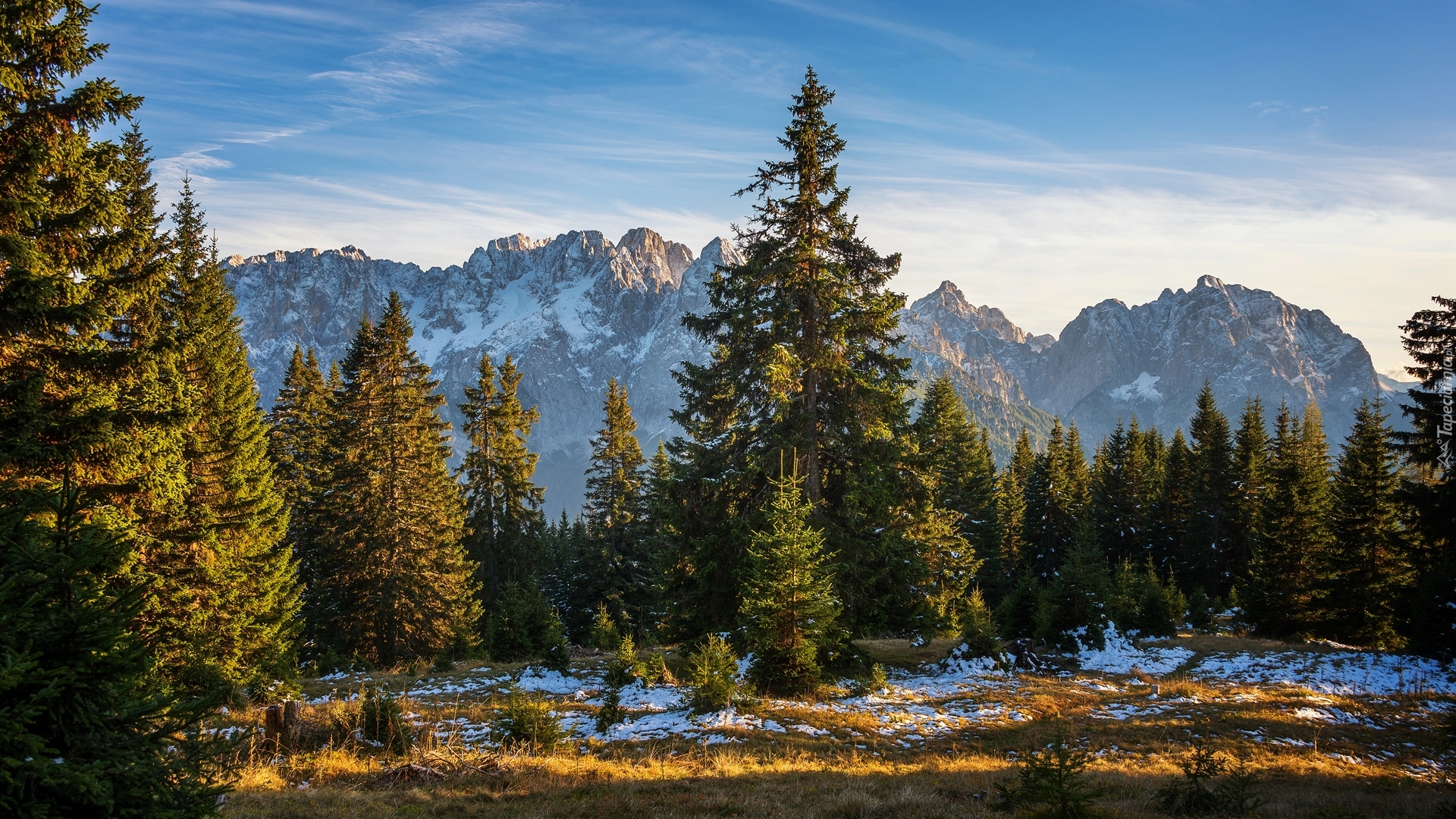 Edytor tapety: Drzewa na tle Alp Julijskich