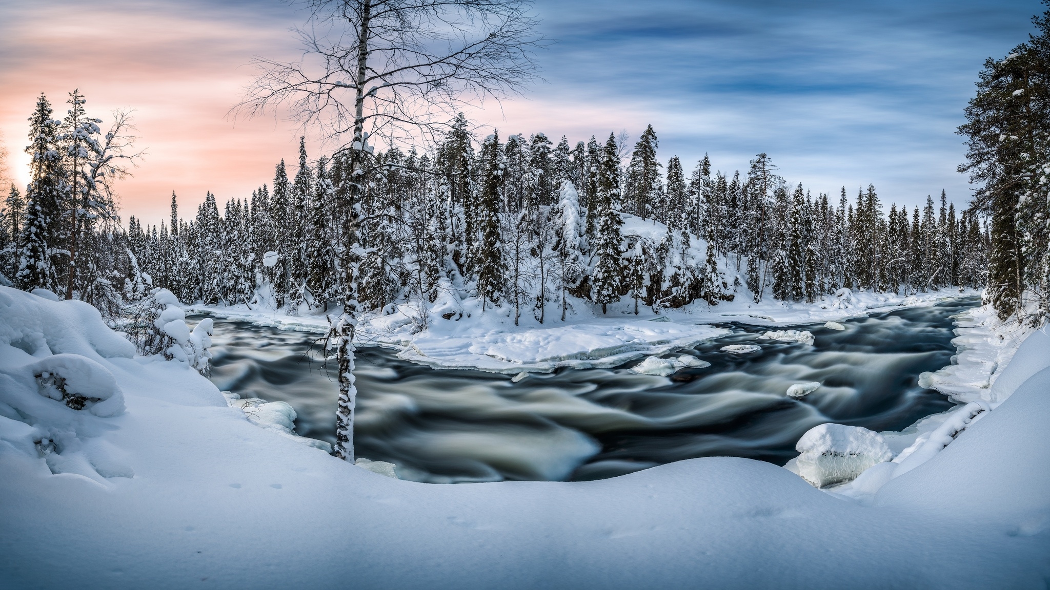 Edytor tapety: Zimowy krajobraz z rzeką i drzewami