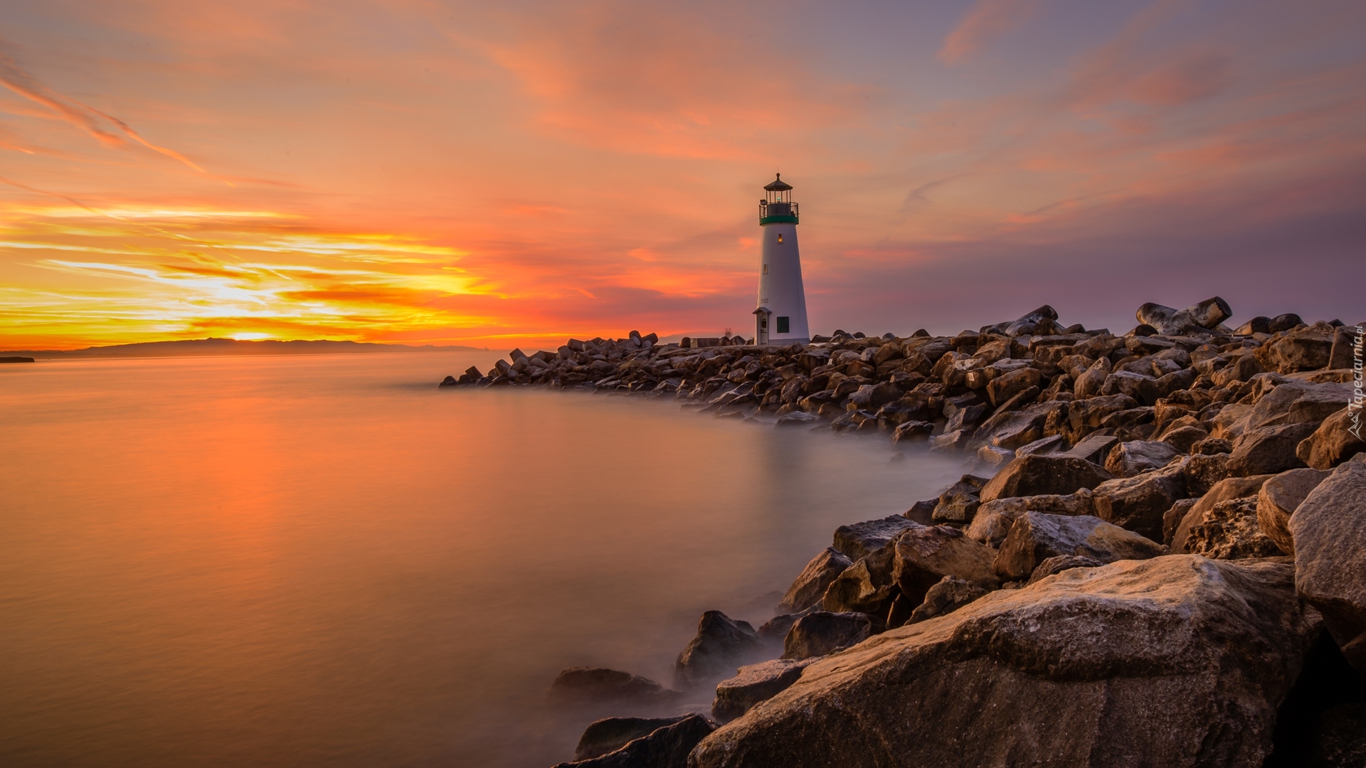 Edytor tapety: Latarnia morska i kolorowe niebo nad morzem