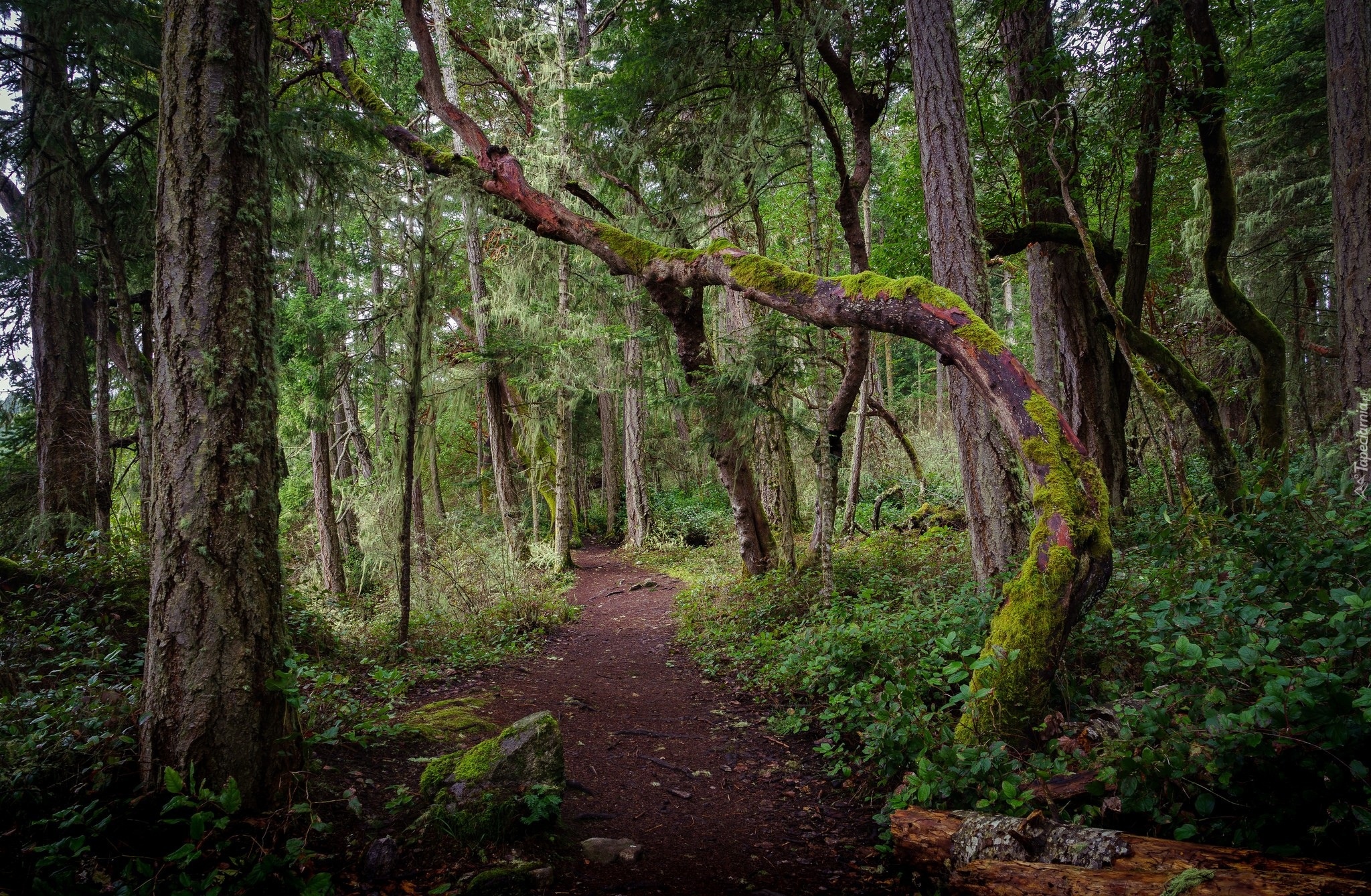 Edytor tapety: Omszałe drzewo przy ścieżce w zielonym lesie
