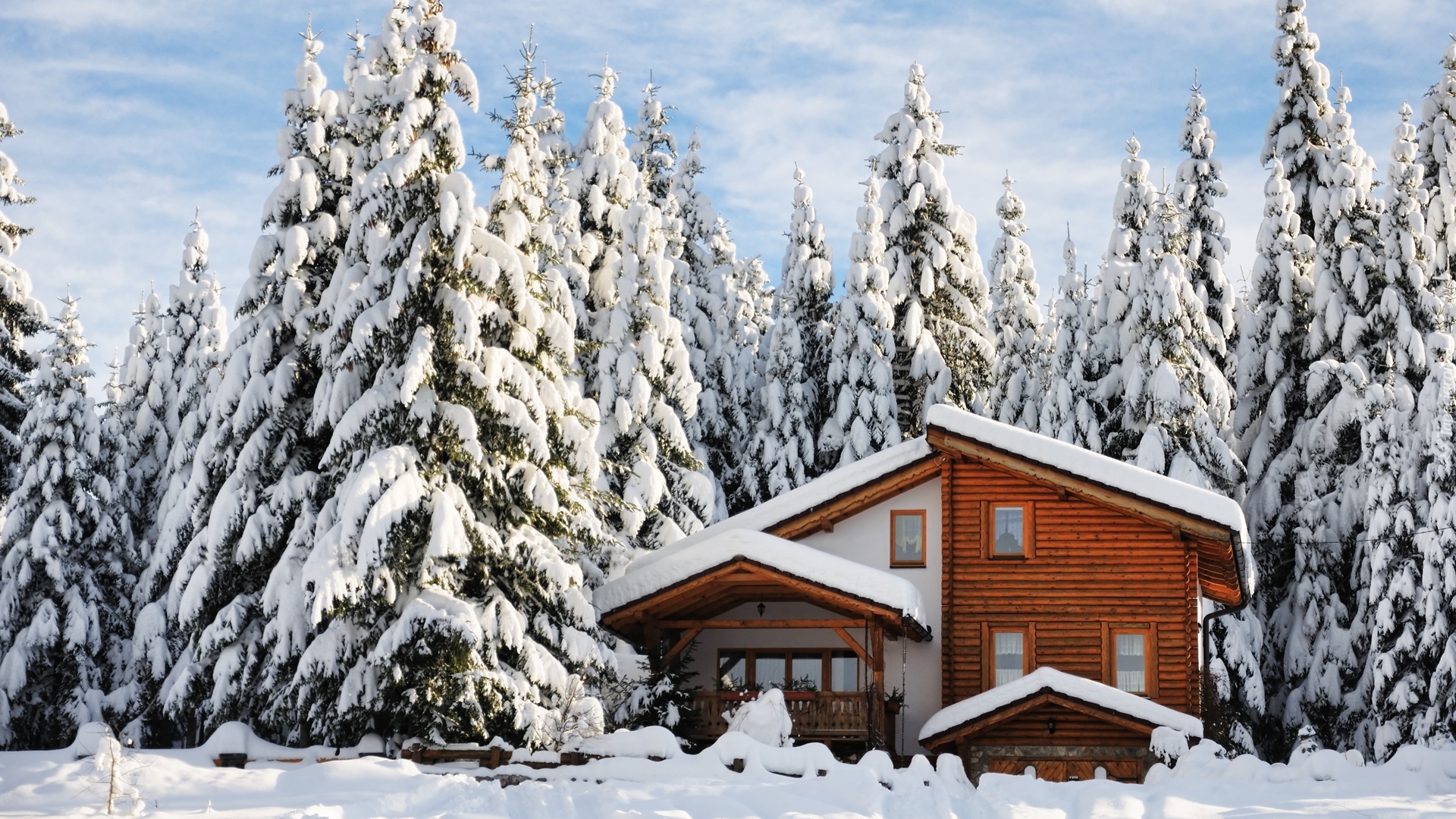 Edytor tapety: Dom wśród ośnieżonych drzew