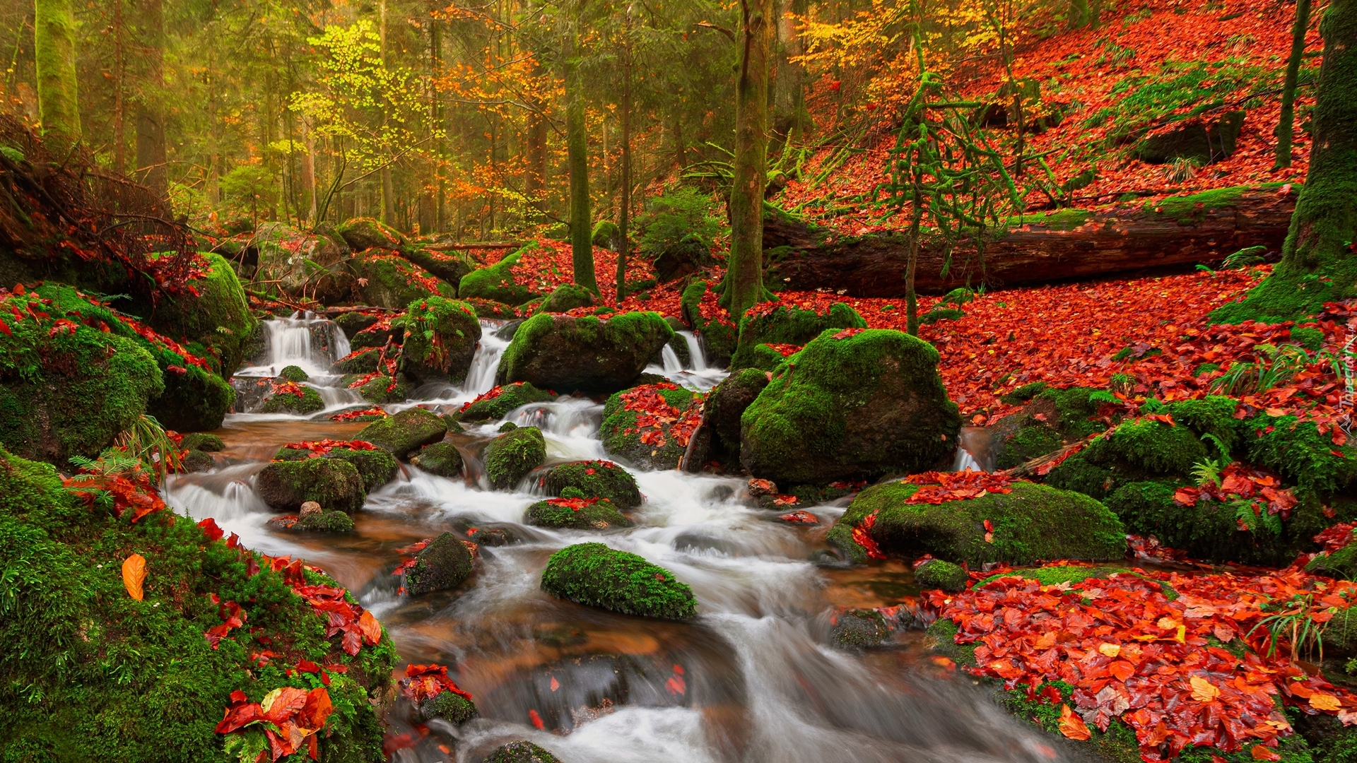 Edytor tapety: Czerwone liście na omszałych kamieniach przy rzece