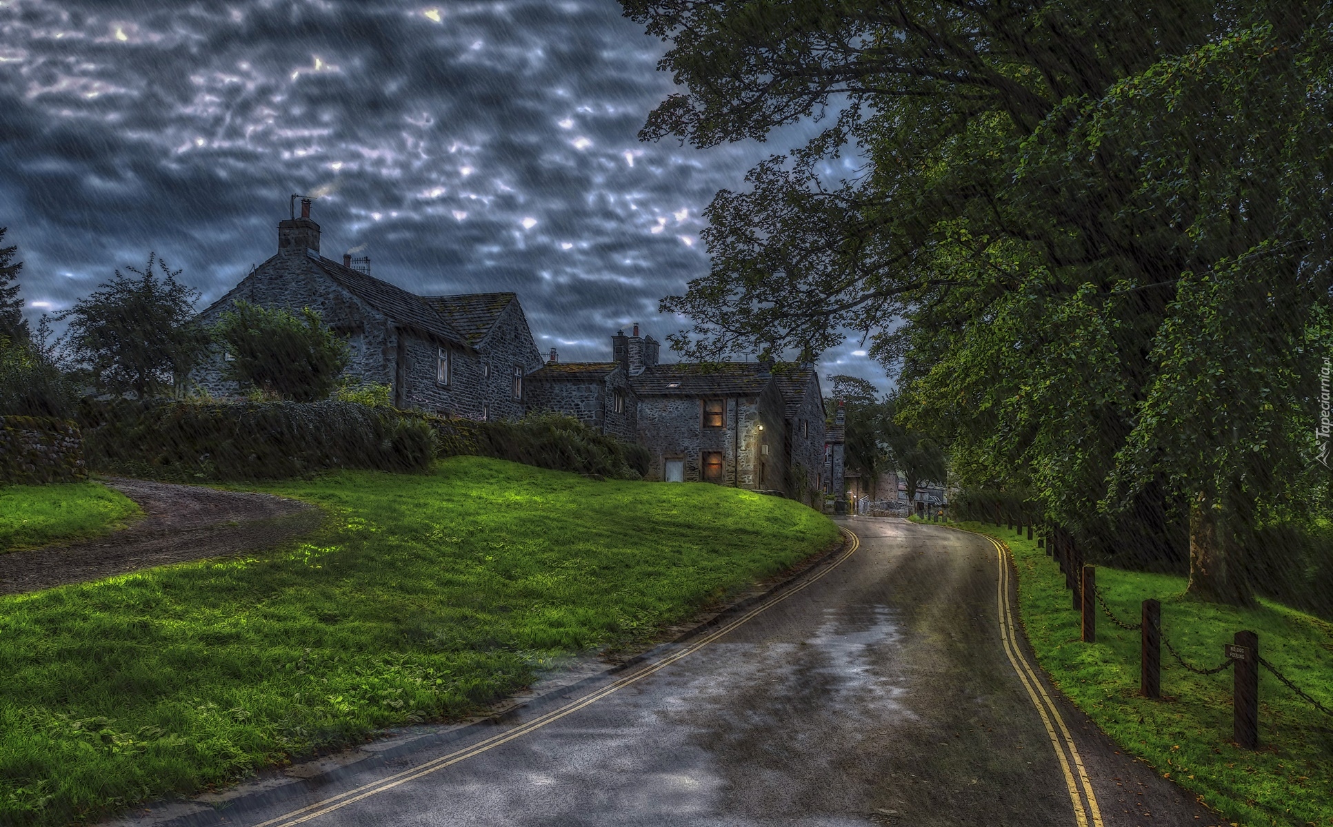 Edytor tapety: Domy i drzewa przy drodze w deszczu