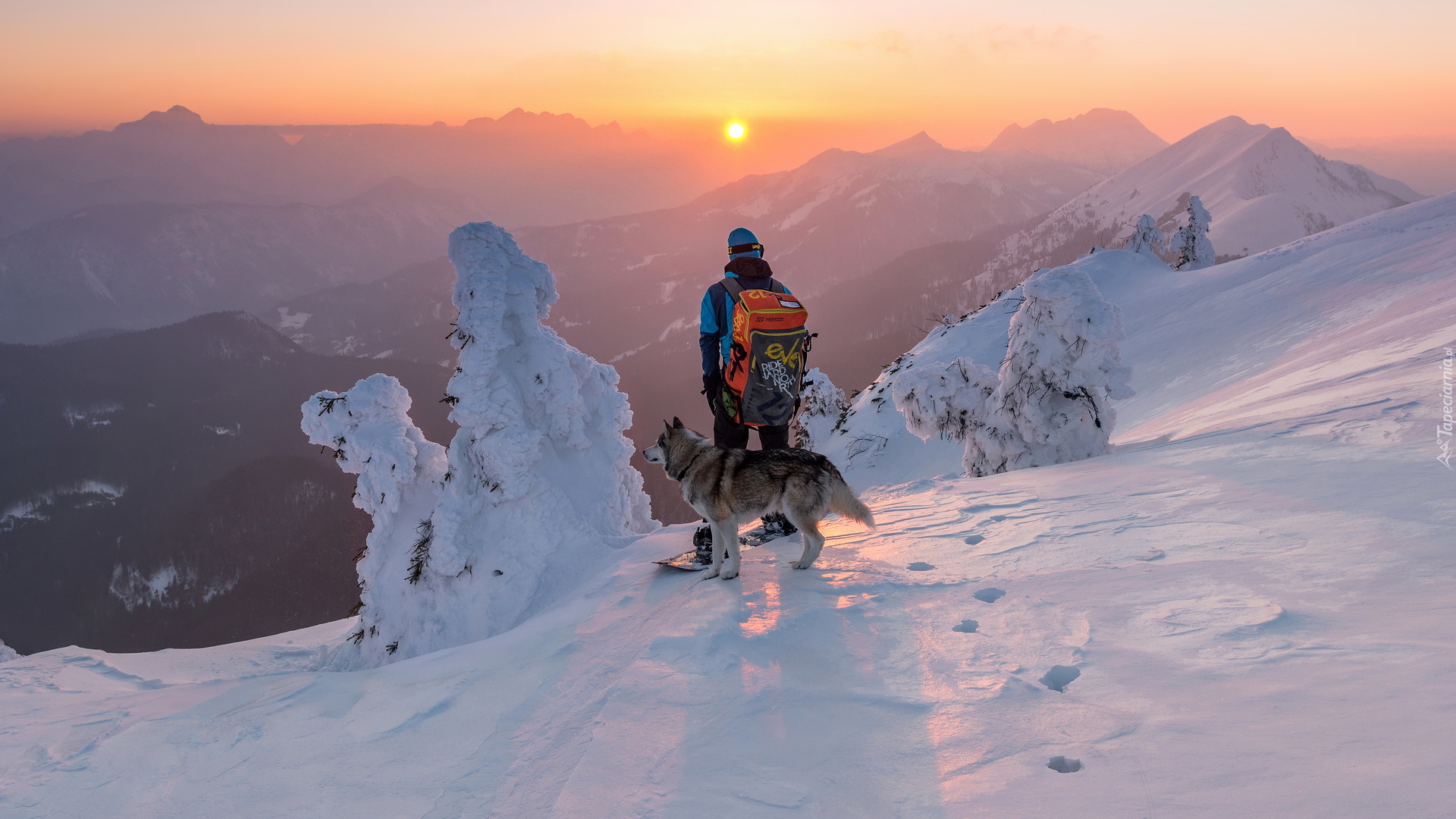 Edytor tapety: Mężczyzna z psem na szczycie góry
