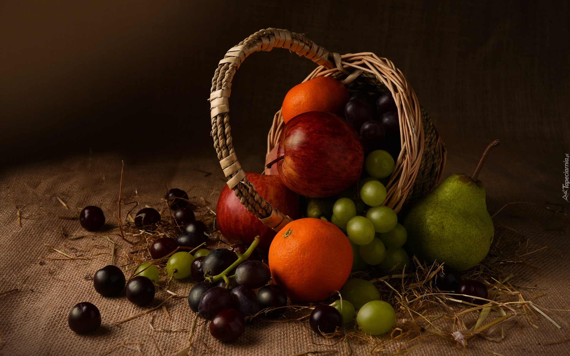 Edytor tapety: Jabłka i pomarańcze pomiędzy winogronami w koszyku