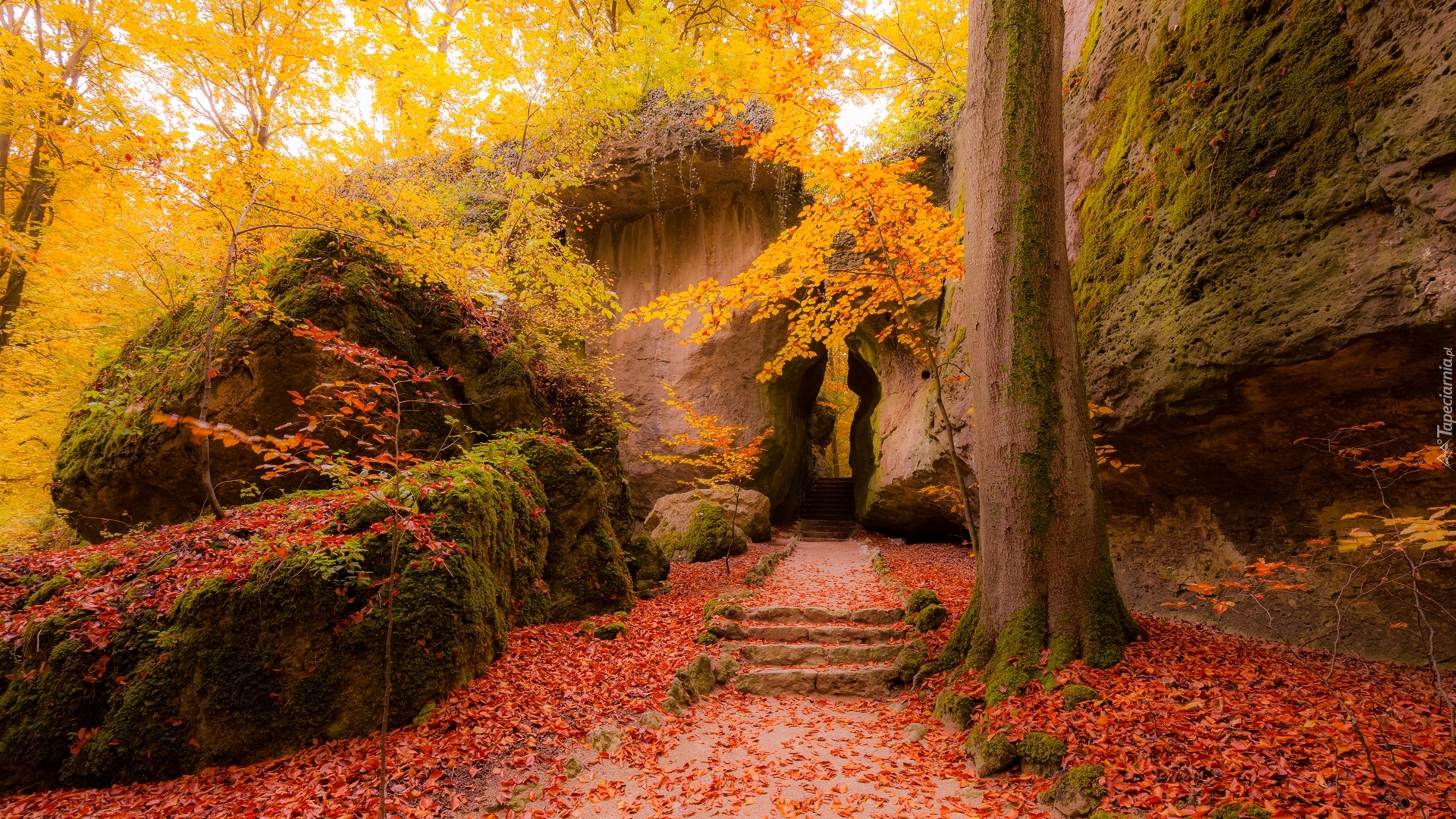 Edytor tapety: Omszałe skały i schodki przy drzewie