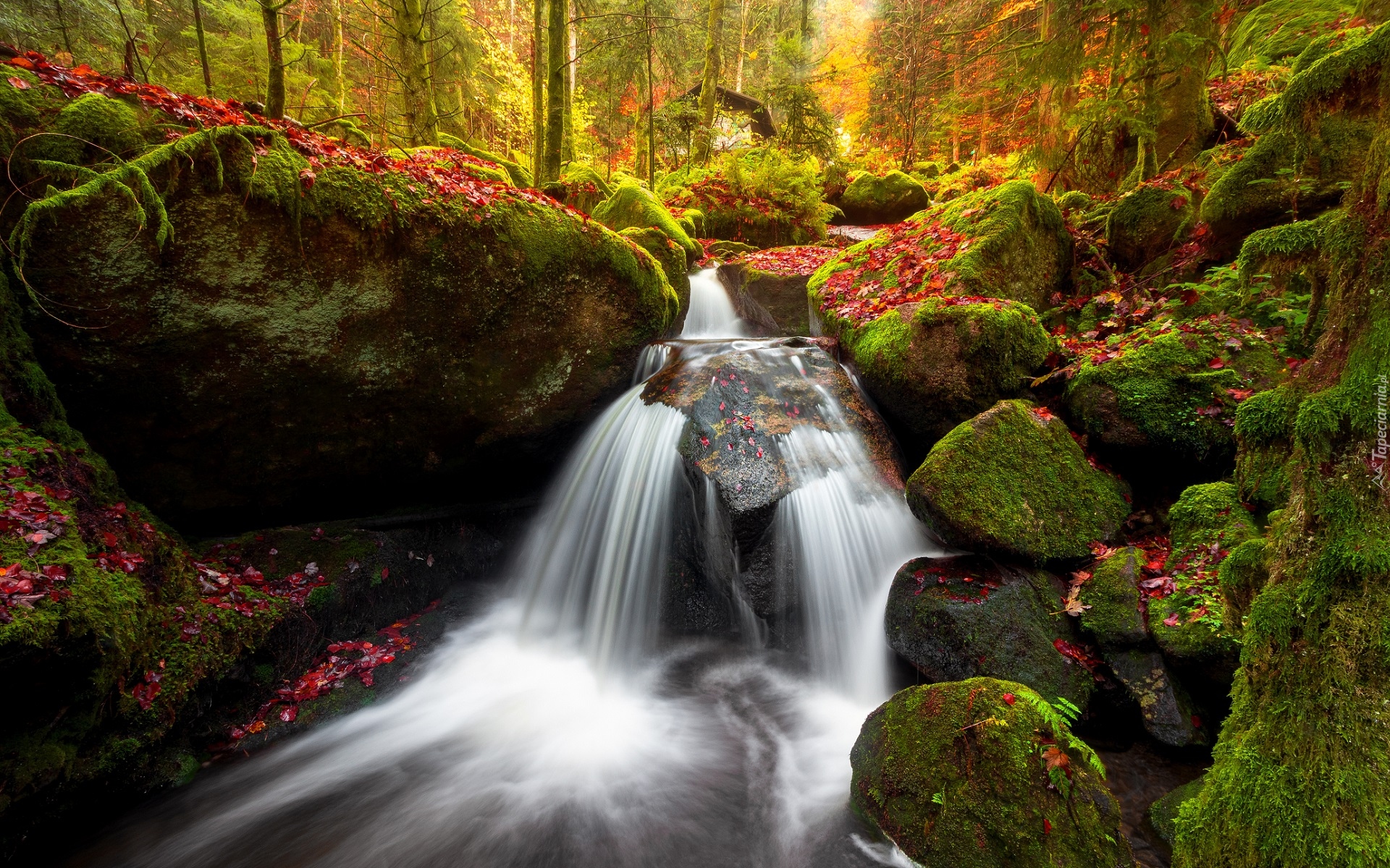Edytor tapety: Omszałe kamienie przy leśnym strumieniu