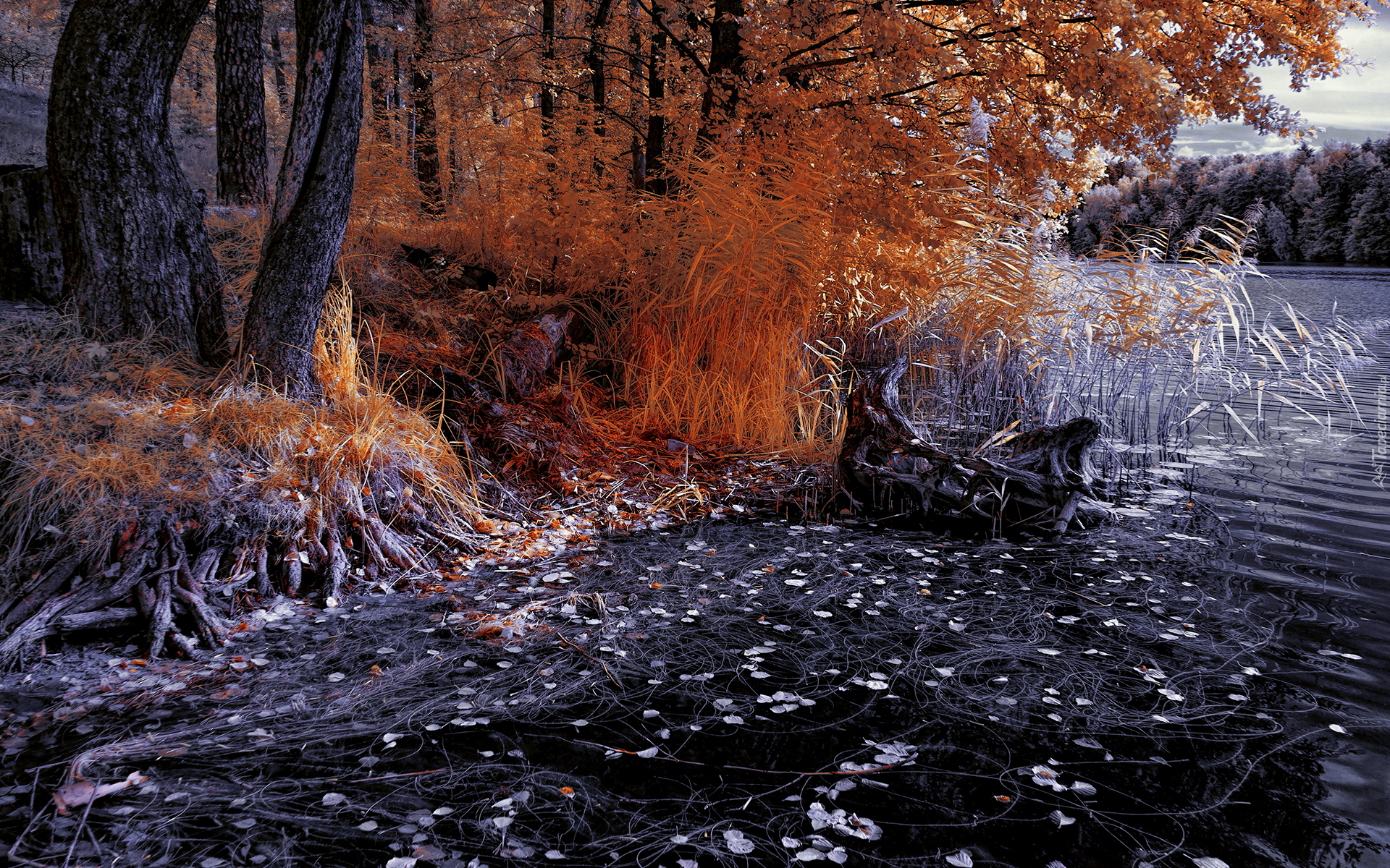 Edytor tapety: Szuwary i drzewa nad brzegiem jeziora jesienią