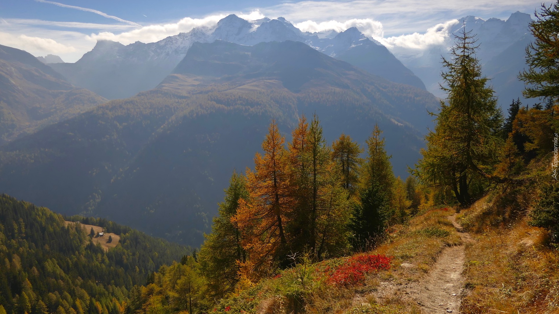 Edytor tapety: Drzewa przy ścieżce w górach