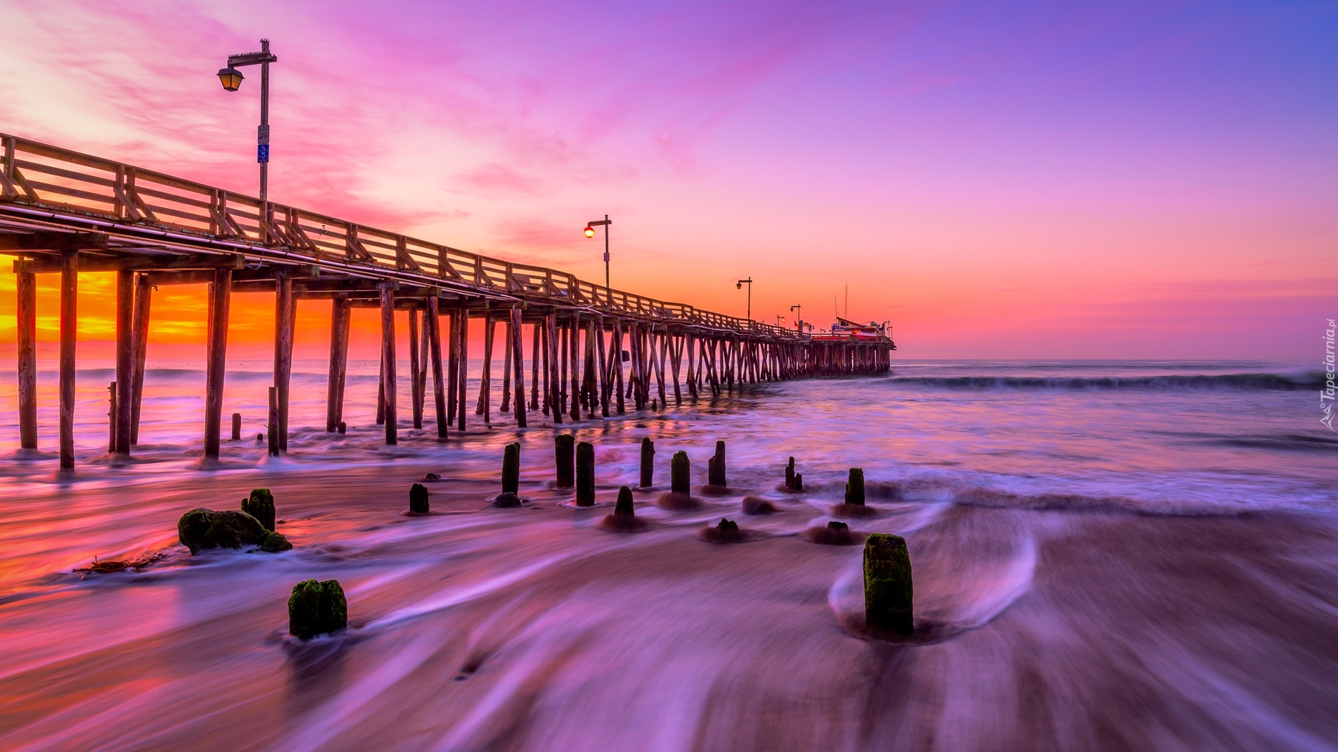 Edytor tapety: Latarnie na molo o zachodzie słońca