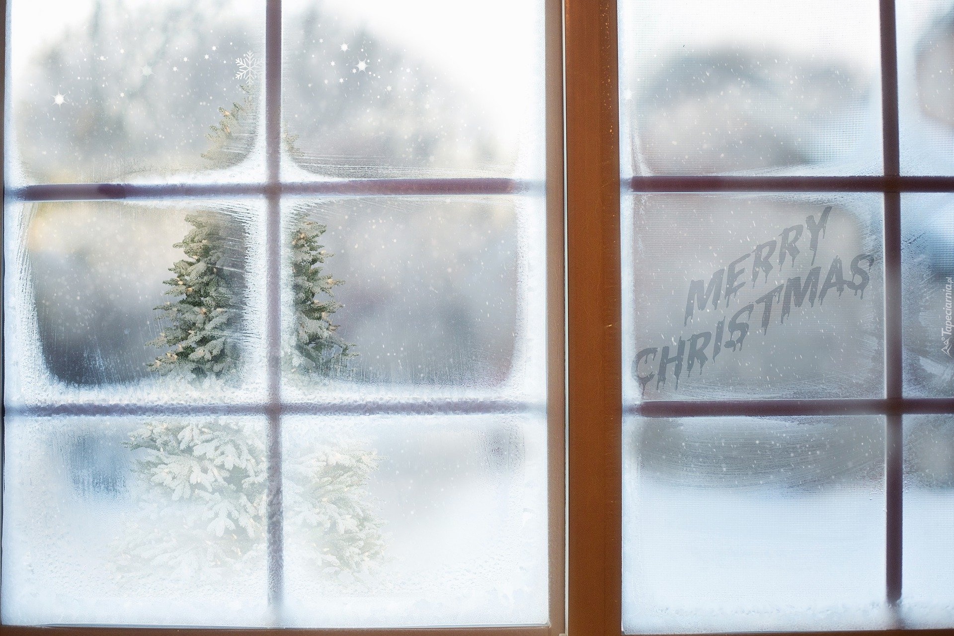 Edytor tapety: Napis Merry Christmas na zamarzniętym oknie