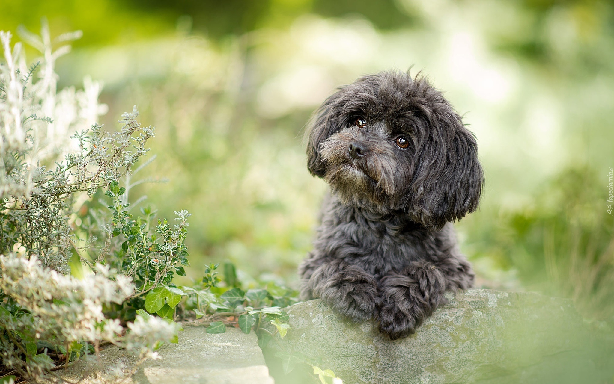 Edytor tapety: Pudel toy leżący na kamieniu pośród roślin