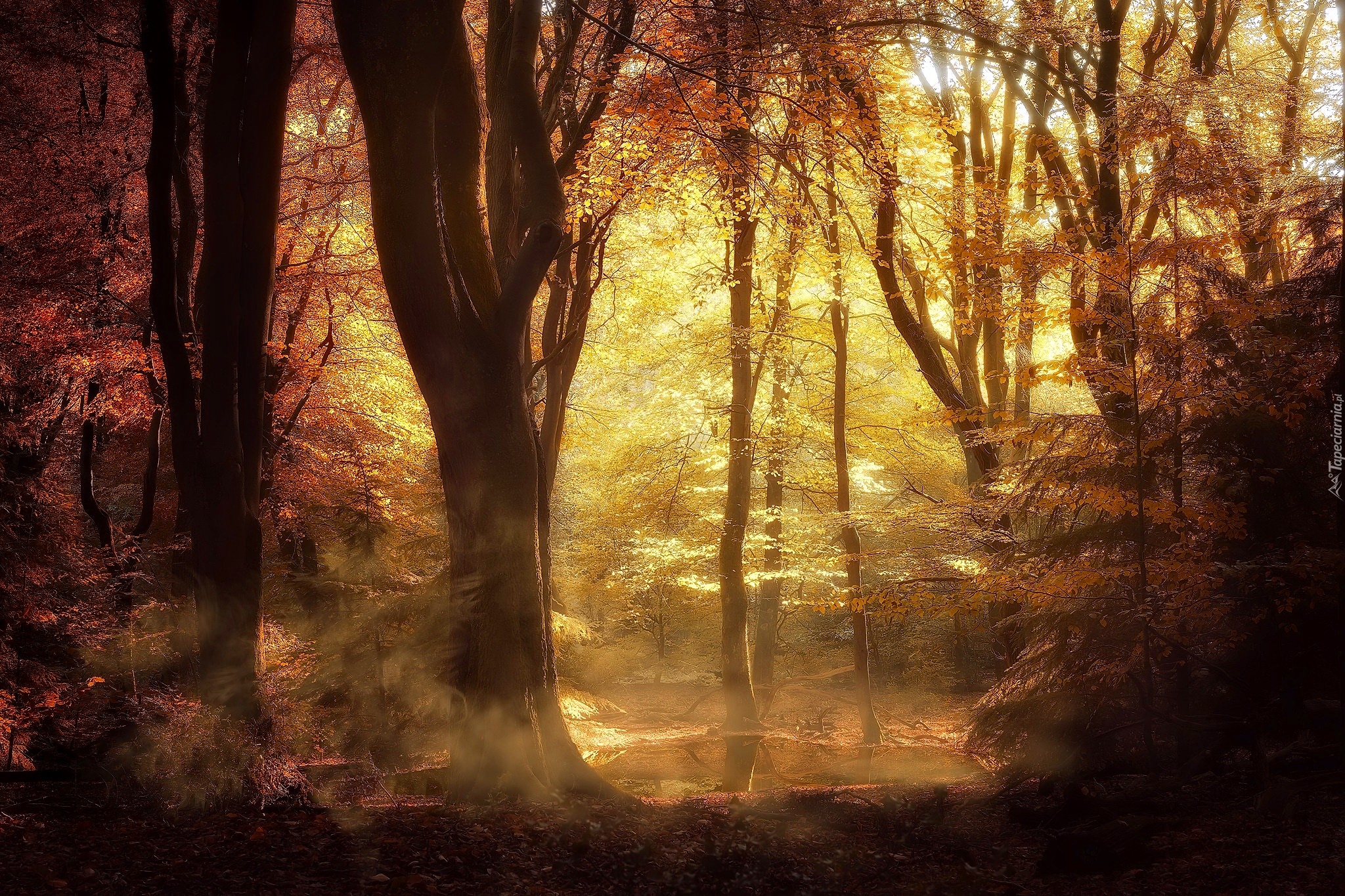 Edytor tapety: Poranne słońce w zamglonym lesie