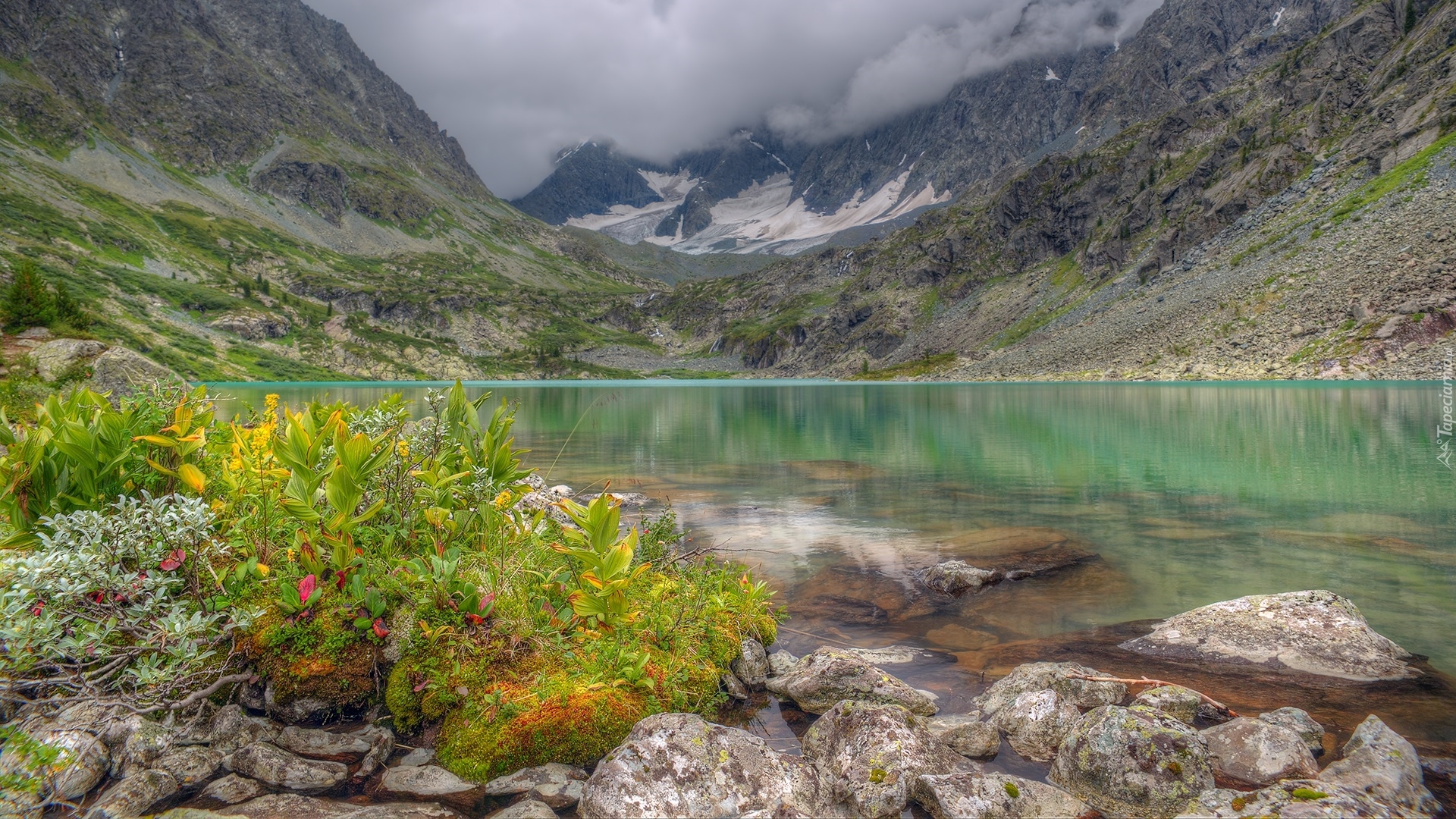 Edytor tapety: Rośliny na kamieniach nad jeziorem