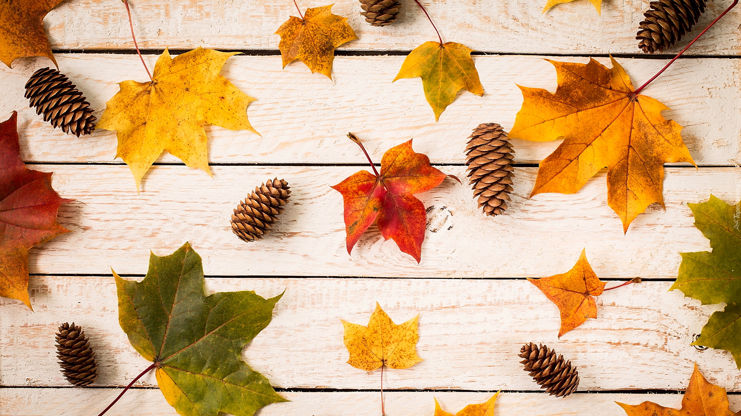 Edytor tapety: Szyszki i liście klonu na deskach