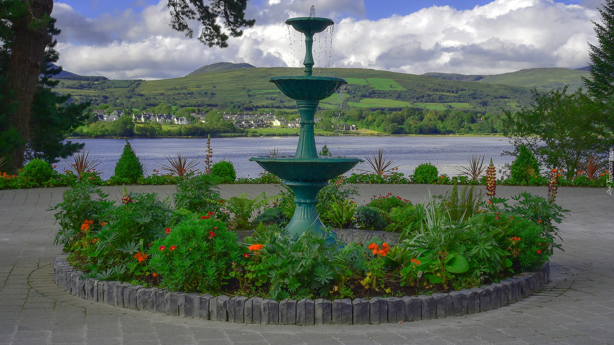 Edytor tapety: Rabatka z fontanną w mieście Kenmare w Irlandii