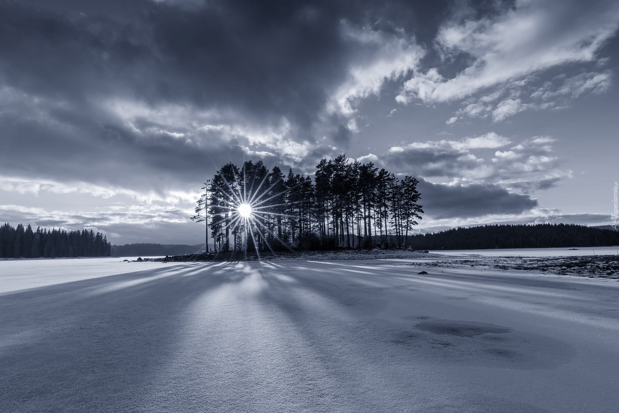 Edytor tapety: Zimowy krajobraz z drzewami w tle