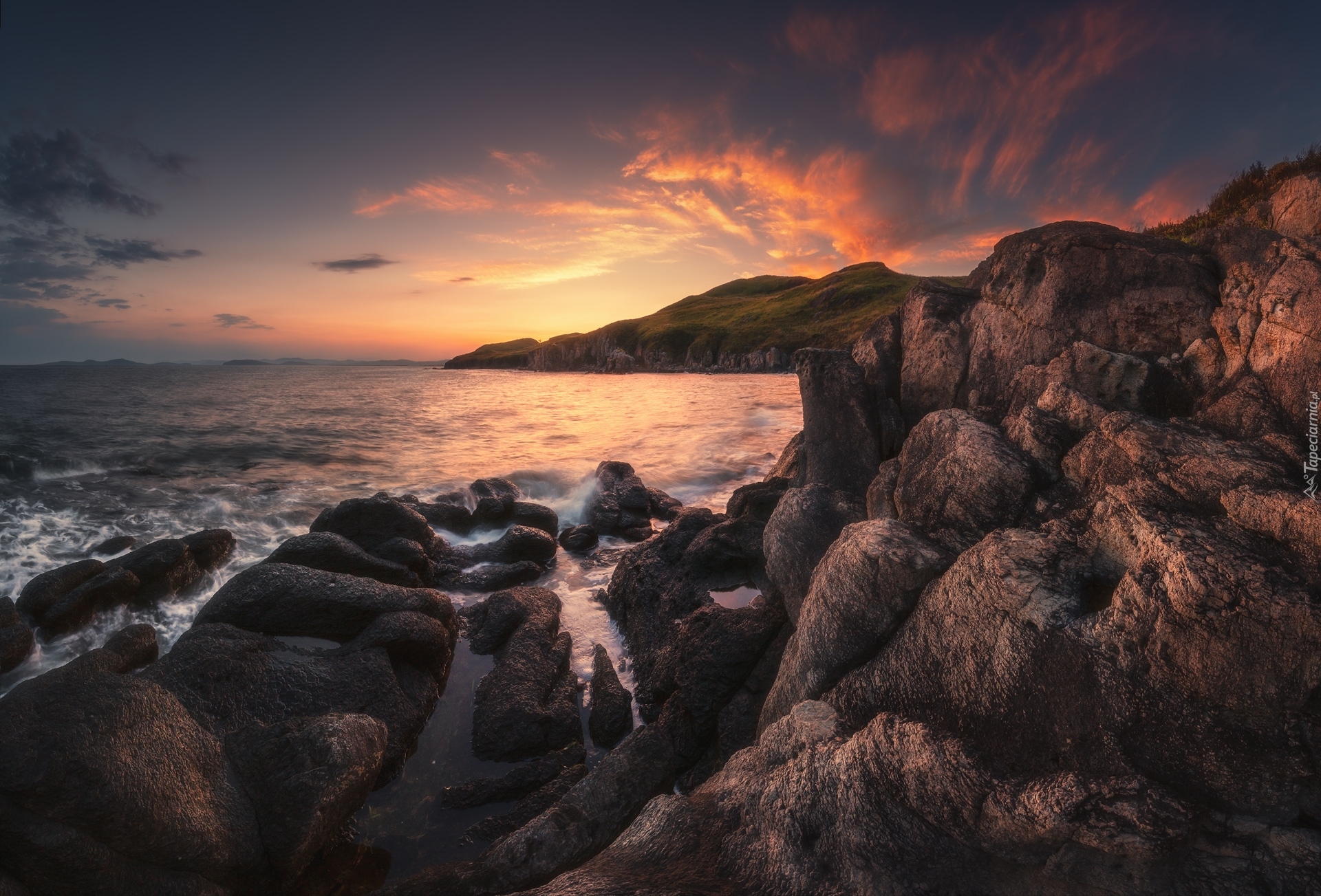 Edytor tapety: Wschodzące słońce nad skalistym wybrzeżem