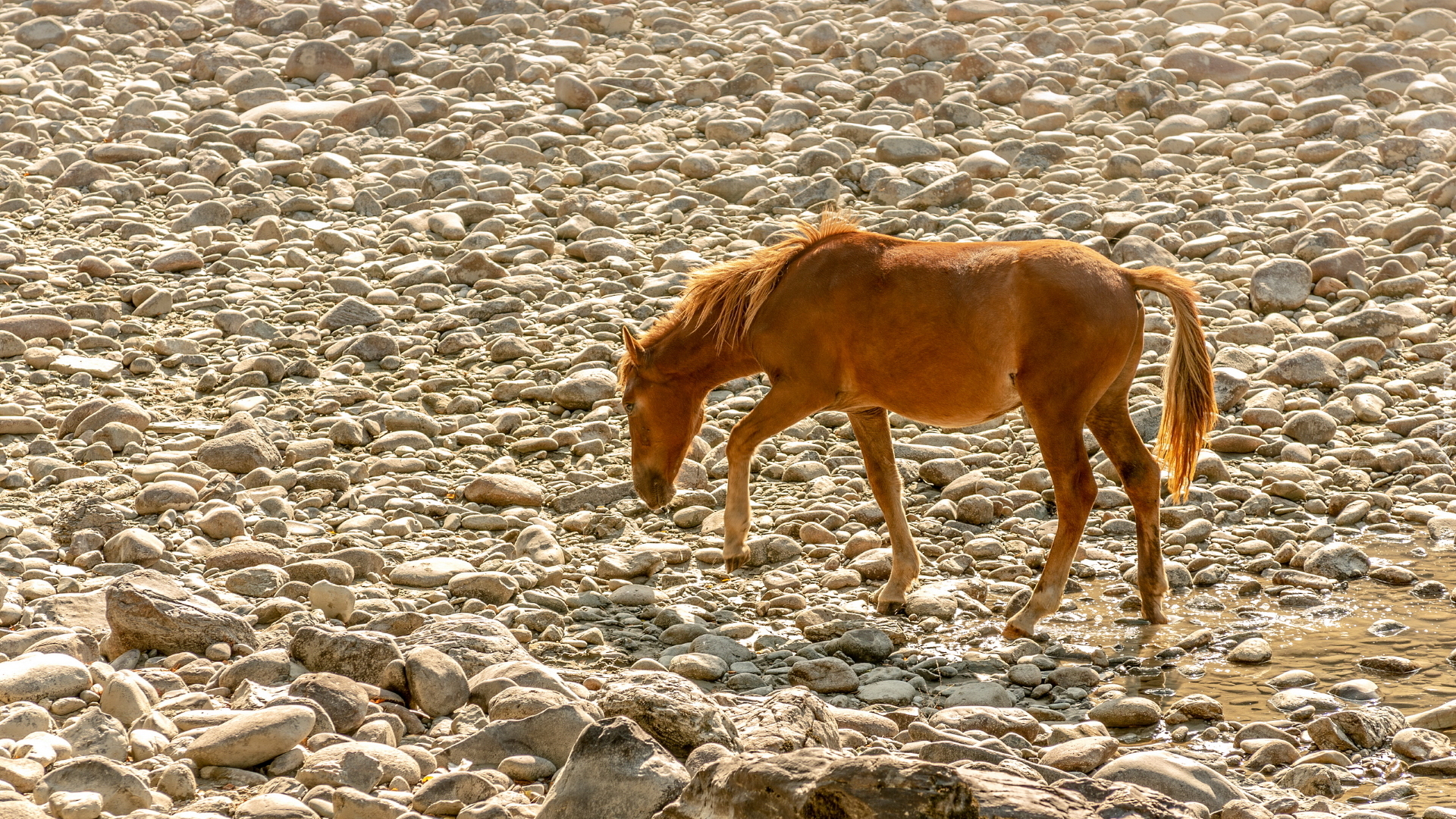 Edytor tapety: Kasztanowaty koń na kamieniach
